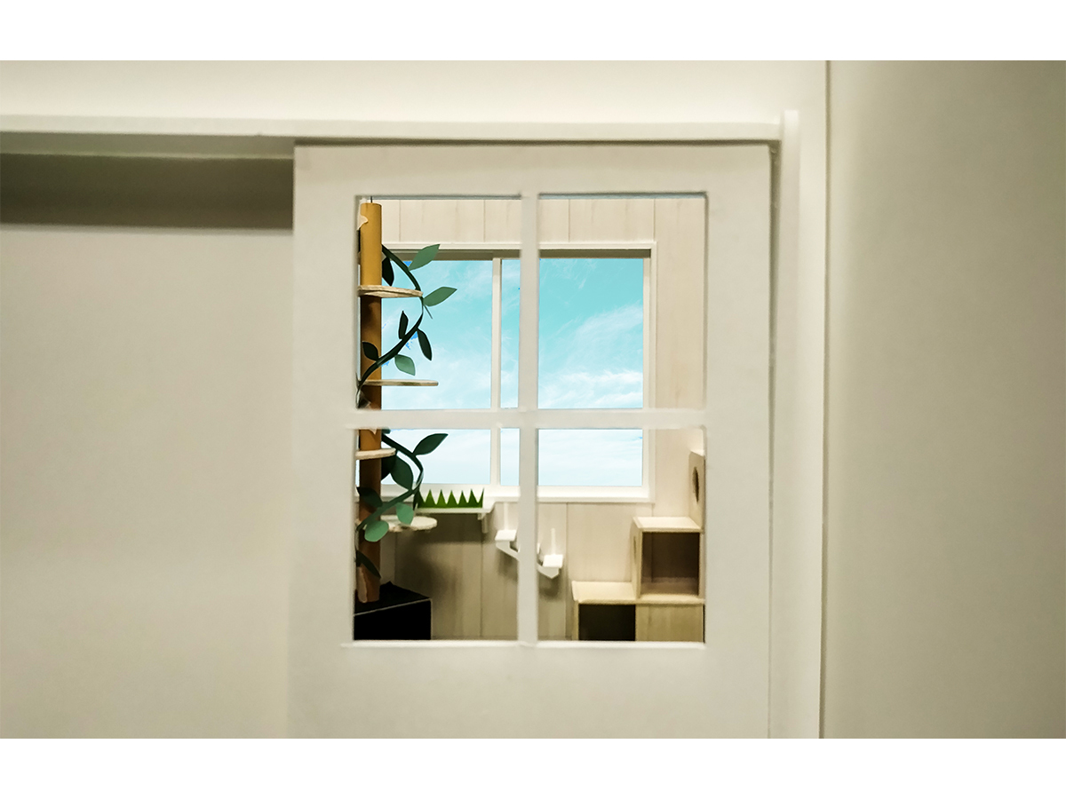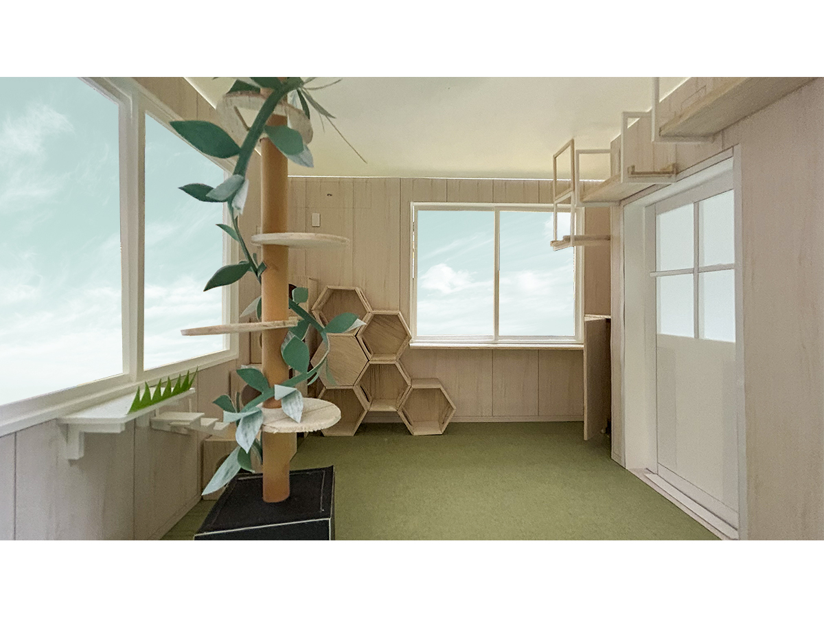 具体的には、エントランスを入ると猫が外にいるかのように、部屋の中を立体的に回遊できるように配置されたキャットウォークやキャットタワーで遊んだり、「すみっこ」で寝たり・隠れたりできる「ねこ庭」があり、「ねこ庭」を通って、猫と人が自宅にいる感覚でリラックスしてゆっくり触れ合える「ねこリビング」、その奥に「ねこリビング」から見通せる「ならし部屋」を配置する平面構成としました。それぞれの部屋は意図や目的・機能に応じた素材・色彩としつつ、グラデーショナルに配色を変化させていくことで、それぞれの部屋の個性を生かしつつも「ねこの家」全体にまとまりと広がりを感じられるように配慮しました。