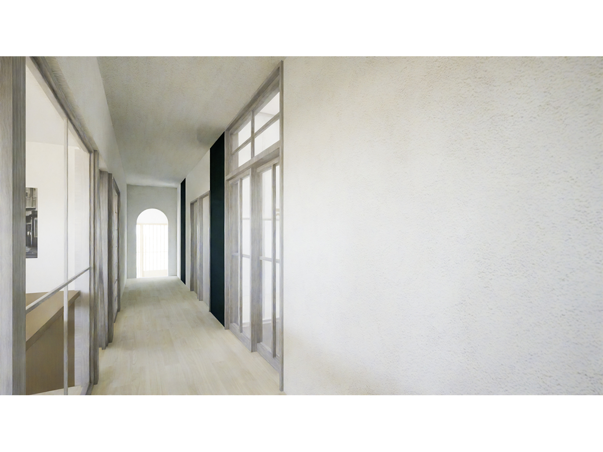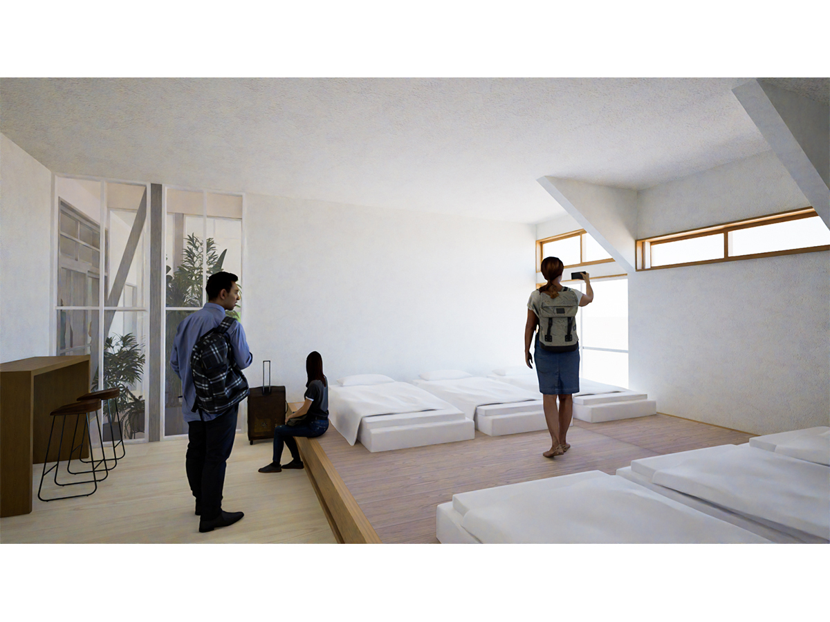 また各部屋の床面積が大きかったことから、1階の「つづき間」を壁で区画し2・3・6名用の3つの宿泊室をつくり、既存の浴室を解体しLDと一室にすることで、宿泊者用のLDKとしました。建物の中心部分にあるエレベーターは撤去し、2層吹抜けの光井戸とすることで、採光や通風、高さ方向の空間的な広がりをつくる計画としています。