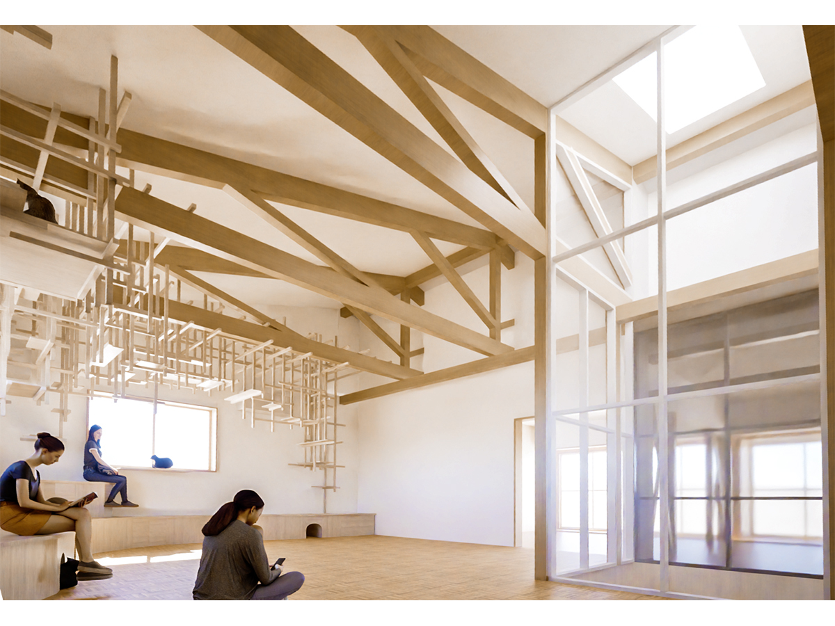 2階部分は「住まい」ですが、光井戸に面した大部屋は天井を撤去し、ヨガやメディテーション等を行う梁現しの高天井のスタジオ兼猫の部屋としています。スタジオ内は立体木格子<くも>が床から梁・天井へと格子の密度を変えながら空間を軽やかに舞い、段状に構成された不定形なベンチ<なみ>が<くも>と連動して、空間を引き締めるアクセントとなるよう意図しました。