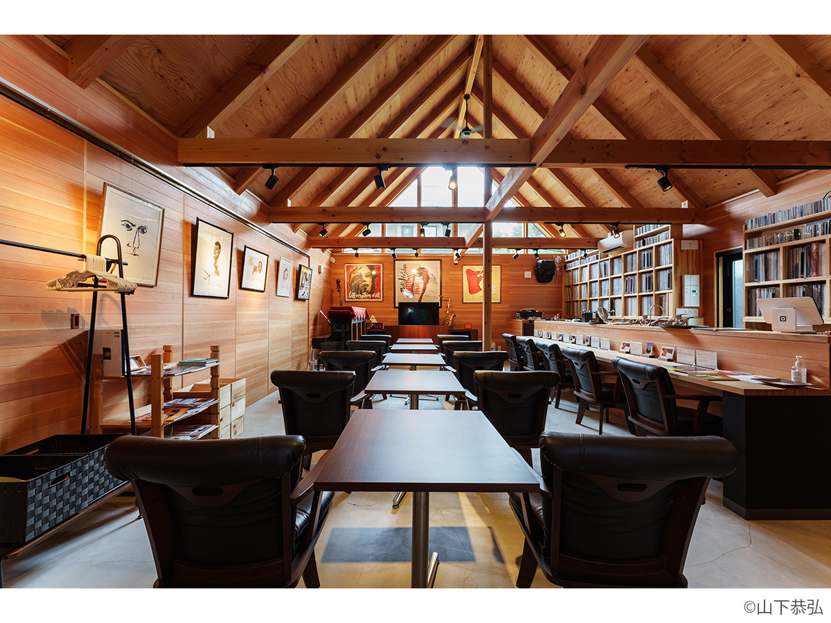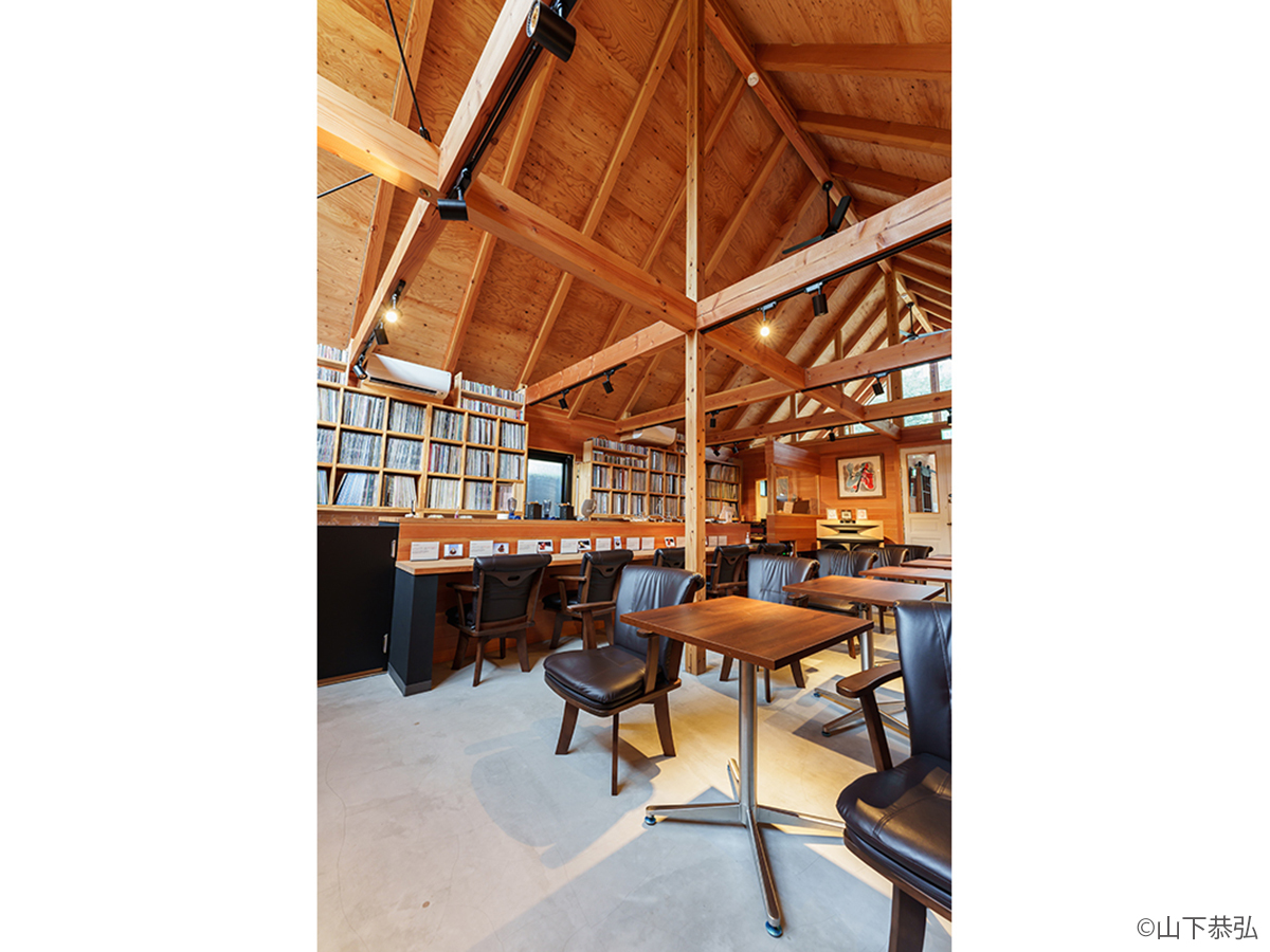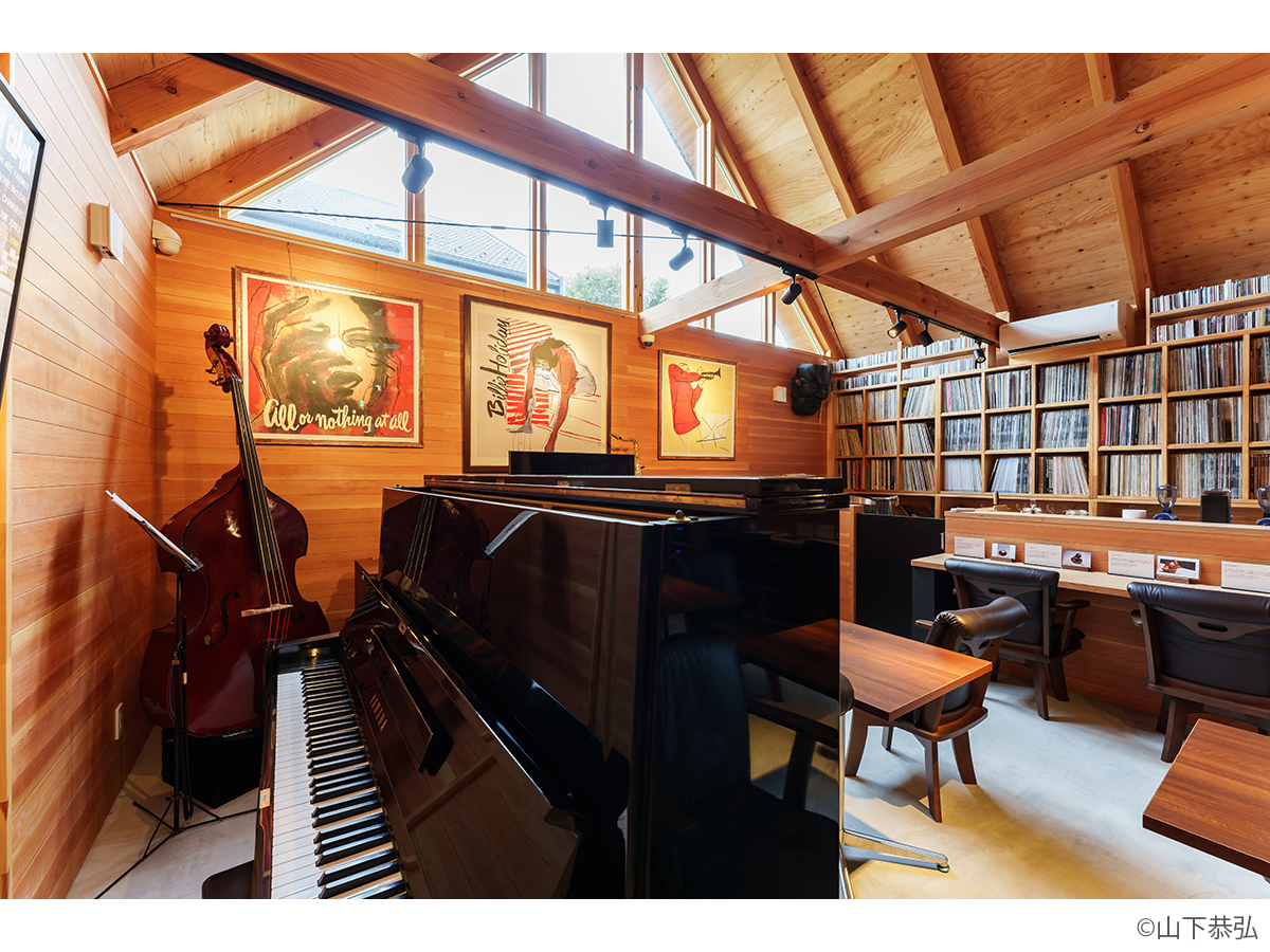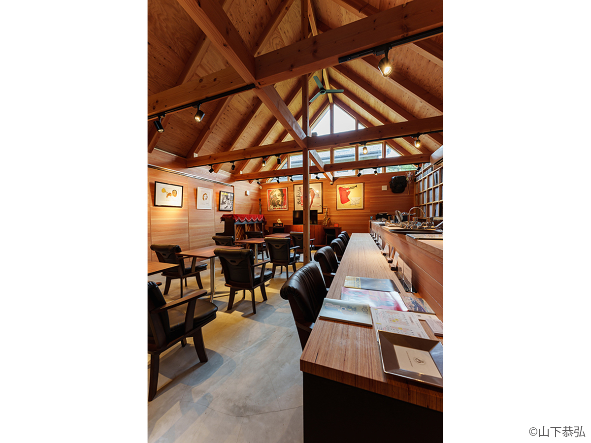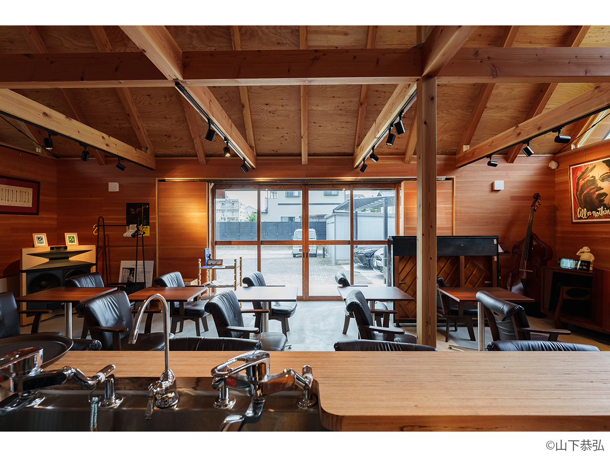 スピーカーから溢れる大音量のジャズとジャズライブの音響を考えると、気積が大きい空間の方が良い。そのため、矩勾配の切妻屋根を架け気積を確保し、両妻面の上部にガラスを入れる事で、展示壁を確保しつつも光が射し込み、外へ視線が抜ける、明るく開放的な空間を実現しようと考えました。内部仕上げは反射と吸音のバランス・「音響」を考慮して、コンクリートとガラス、木を配置しました。いくら「音響」がよくても居心地の良くない空間・場所では「音」を楽しむ事は出来ないし、良い「音」に感じることはないと思います。「音響」と「空間」がバランスし、良質なジャズ体験、そして良い時間を過ごせる空間・場所となればと思い設計しました。