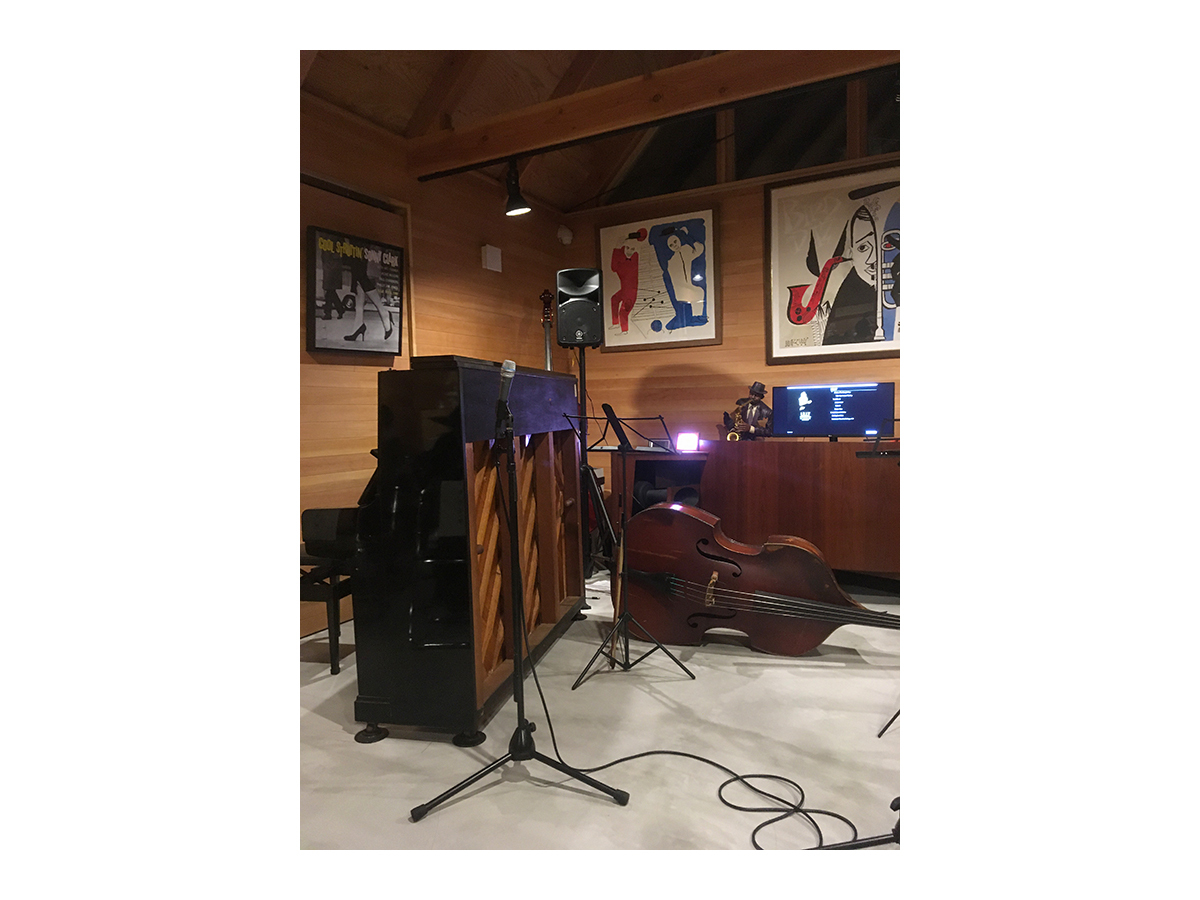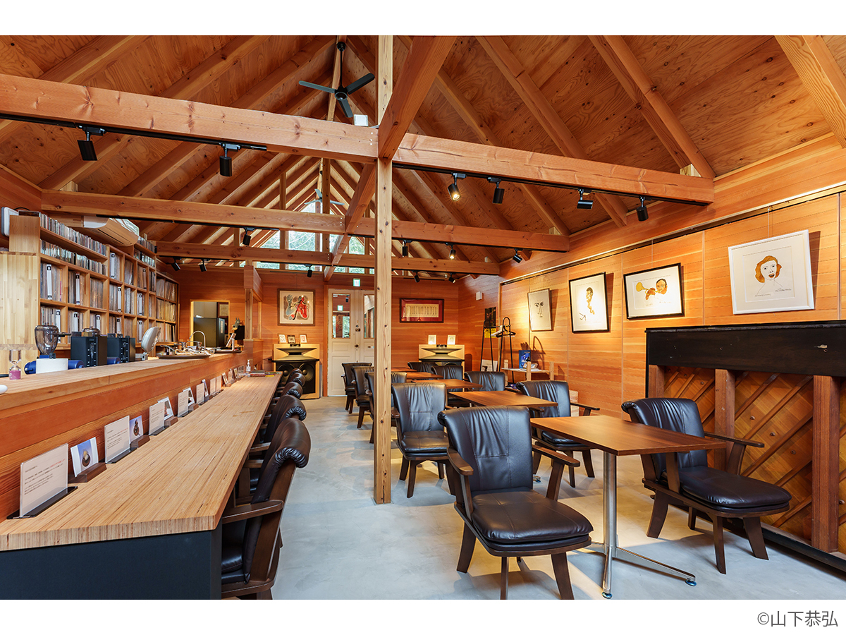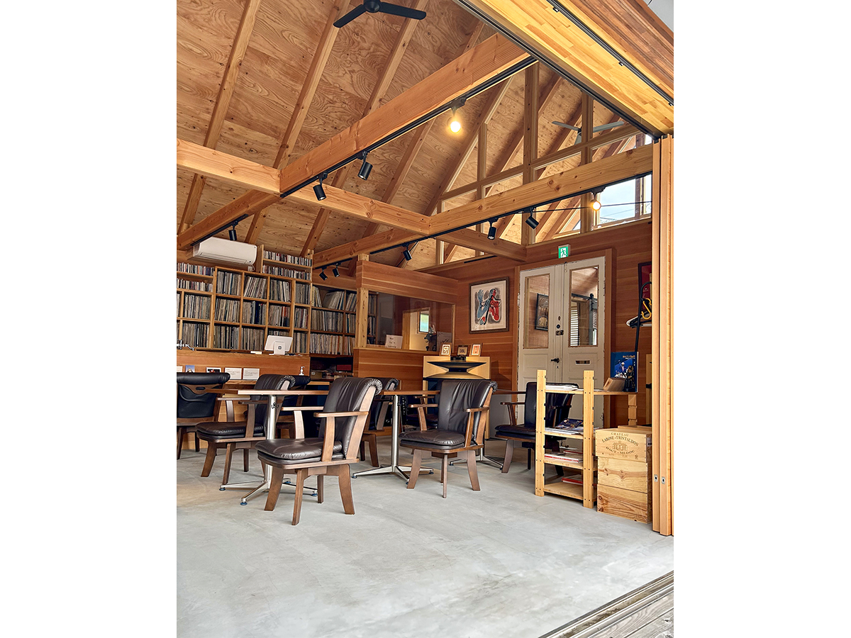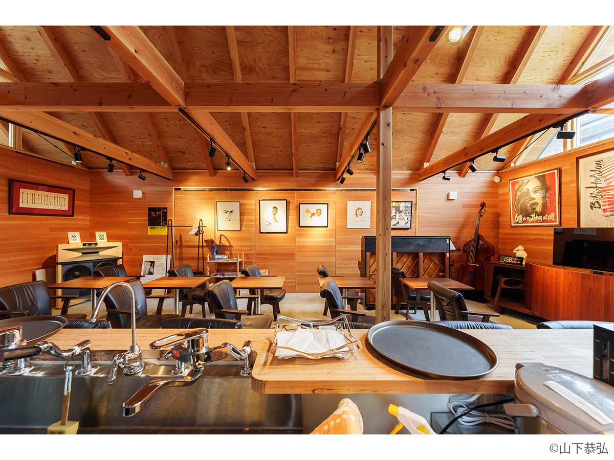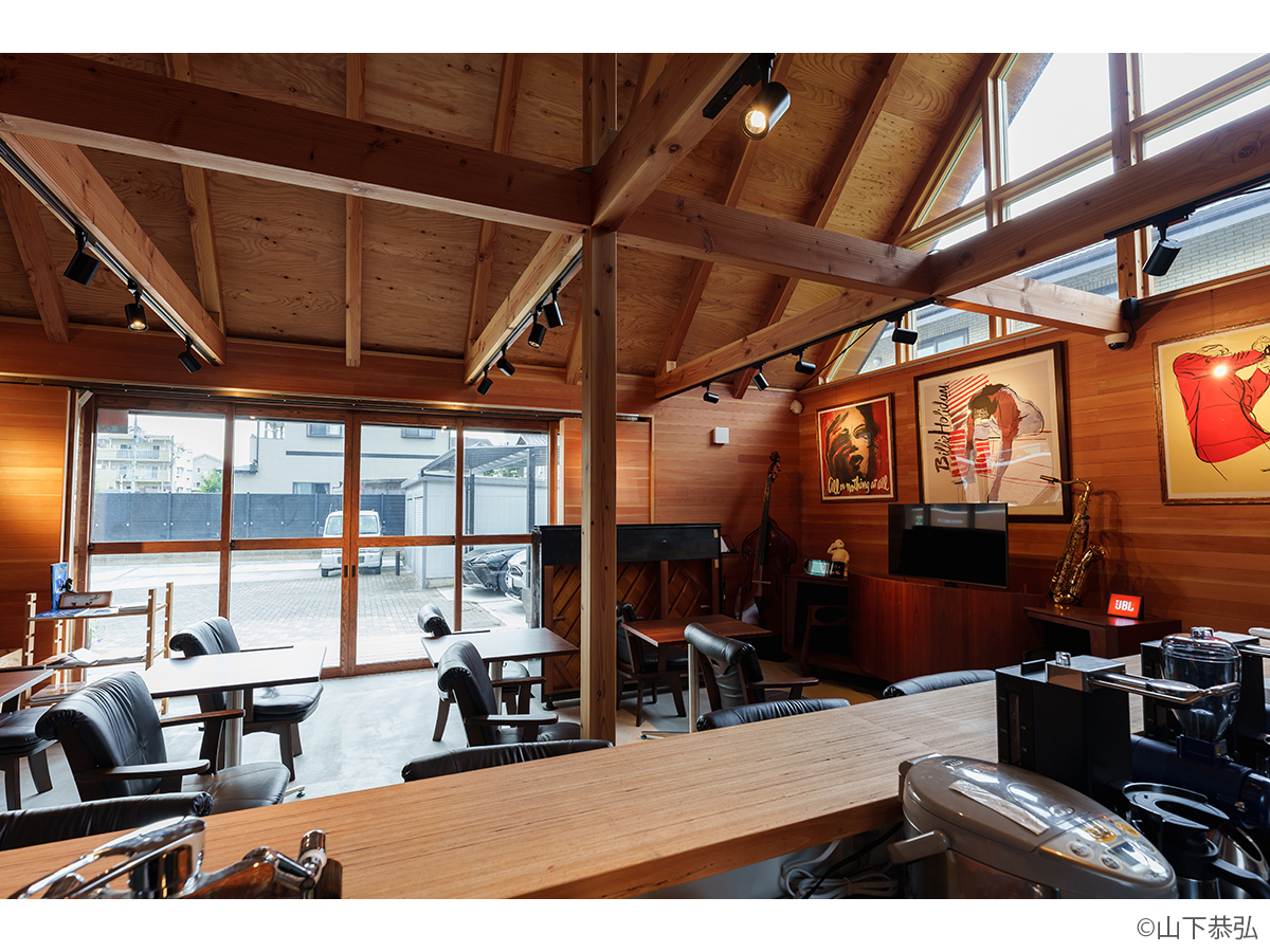 スピーカーから溢れる大音量のジャズとジャズライブの音響を考えると、気積が大きい空間の方が良い。そのため、矩勾配の切妻屋根を架け気積を確保し、両妻面の上部にガラスを入れる事で、展示壁を確保しつつも光が射し込み、外へ視線が抜ける、明るく開放的な空間を実現しようと考えました。内部仕上げは反射と吸音のバランス・「音響」を考慮して、コンクリートとガラス、木を配置しました。いくら「音響」がよくても居心地の良くない空間・場所では「音」を楽しむ事は出来ないし、良い「音」に感じることはないと思います。「音響」と「空間」がバランスし、良質なジャズ体験、そして良い時間を過ごせる空間・場所となればと思い設計しました。