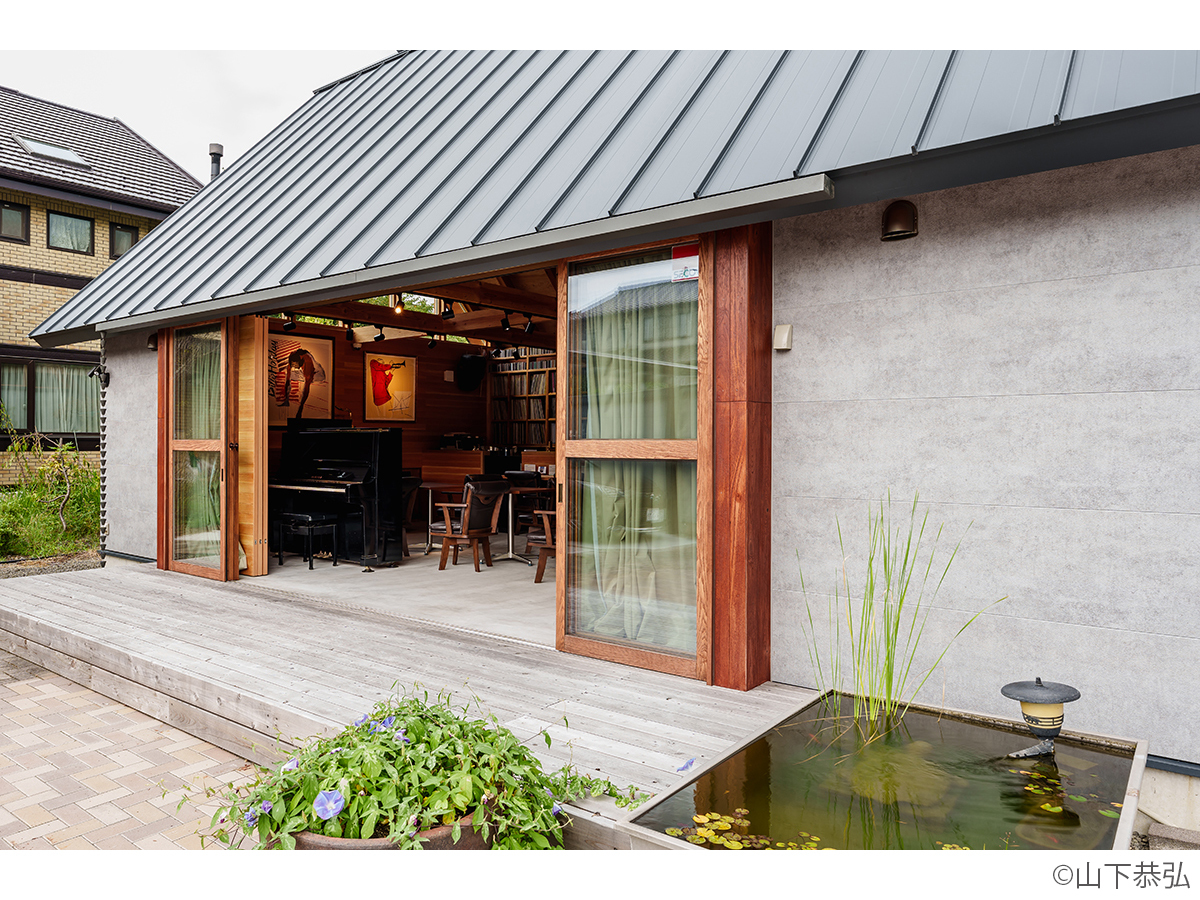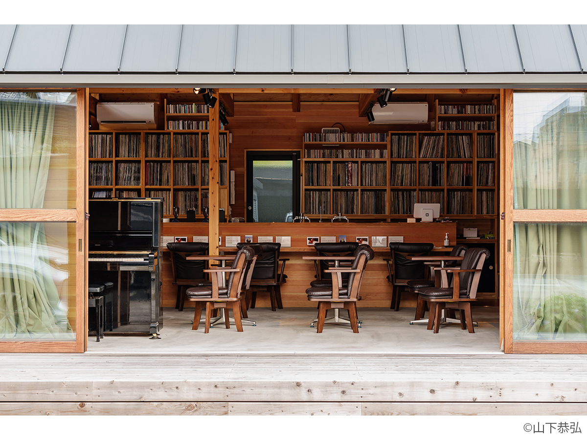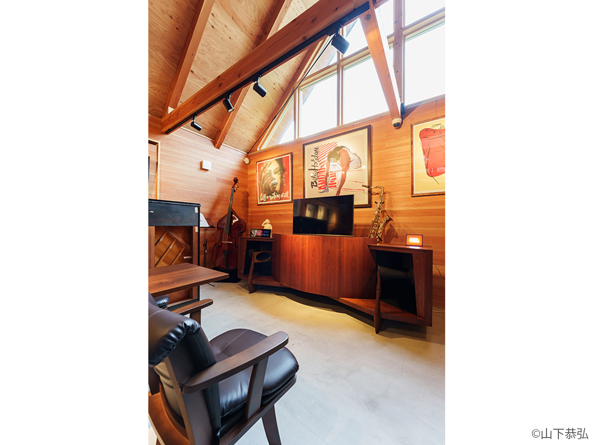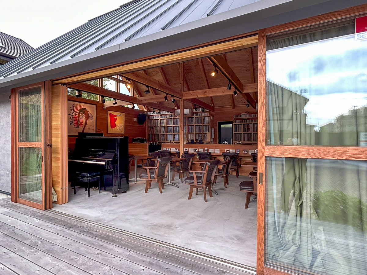 スピーカーから溢れる大音量のジャズとジャズライブの音響を考えると、気積が大きい空間の方が良い。そのため、矩勾配の切妻屋根を架け気積を確保し、両妻面の上部にガラスを入れる事で、展示壁を確保しつつも光が射し込み、外へ視線が抜ける、明るく開放的な空間を実現しようと考えました。内部仕上げは反射と吸音のバランス・「音響」を考慮して、コンクリートとガラス、木を配置しました。いくら「音響」がよくても居心地の良くない空間・場所では「音」を楽しむ事は出来ないし、良い「音」に感じることはないと思います。「音響」と「空間」がバランスし、良質なジャズ体験、そして良い時間を過ごせる空間・場所となればと思い設計しました。