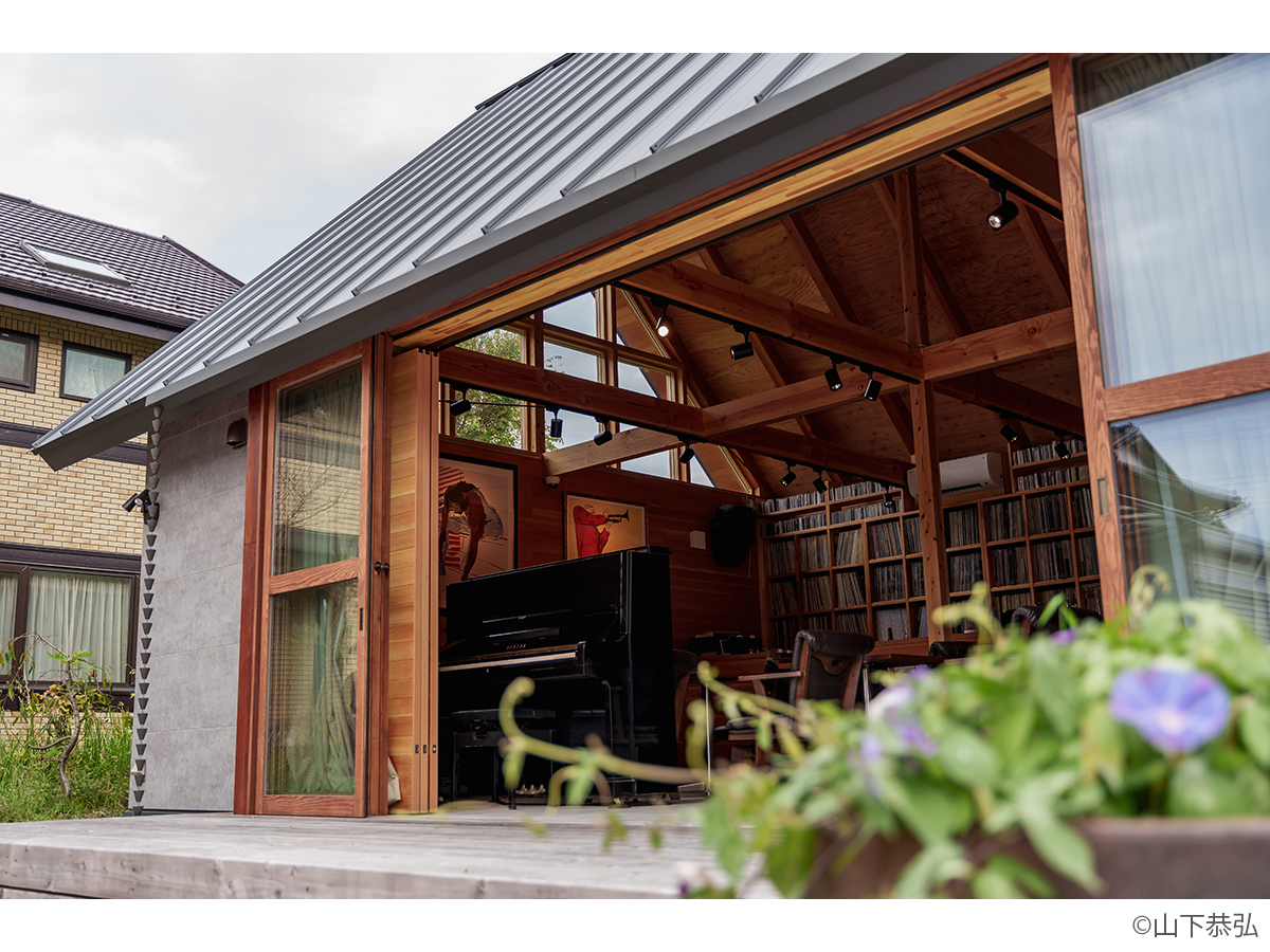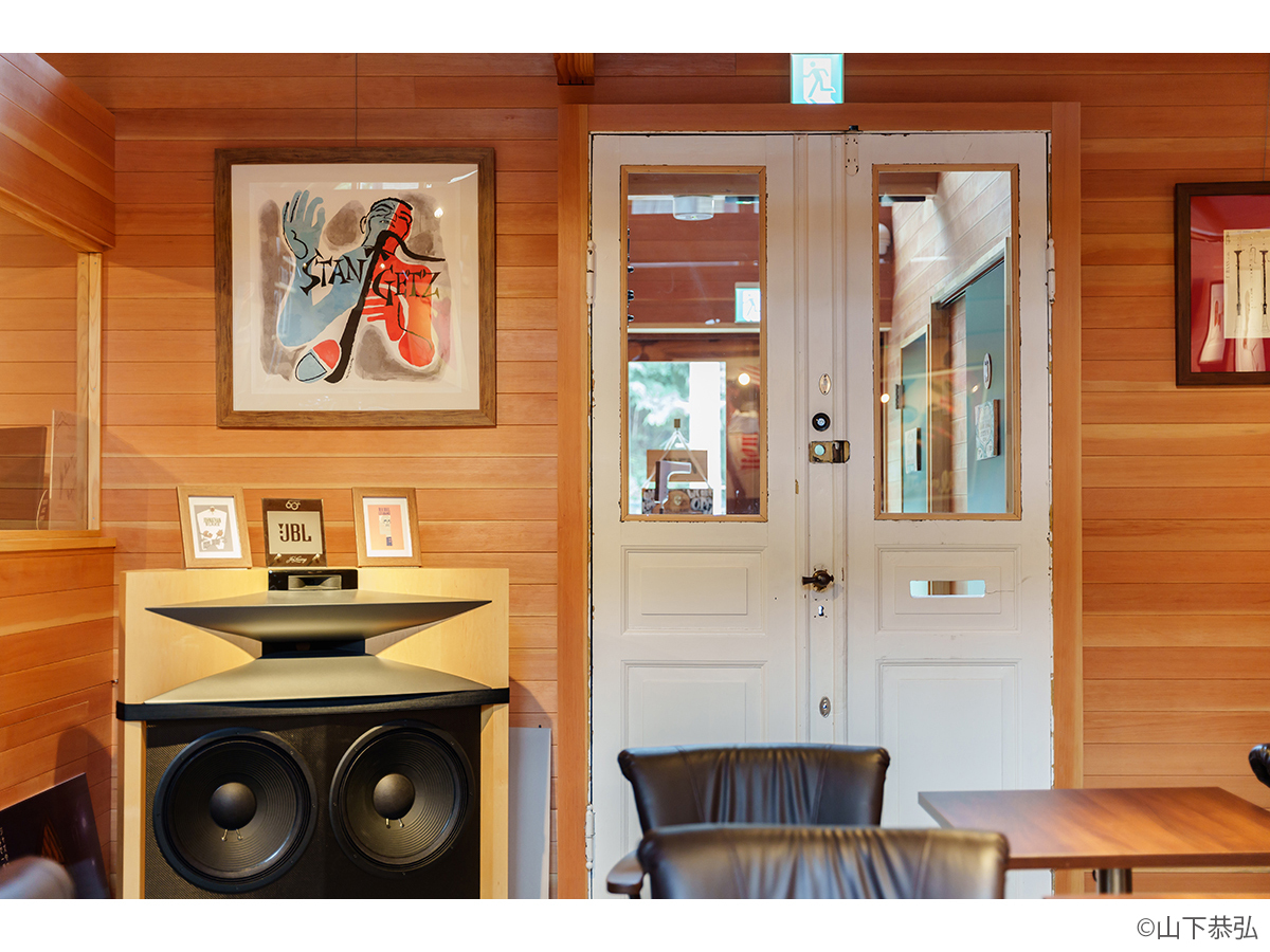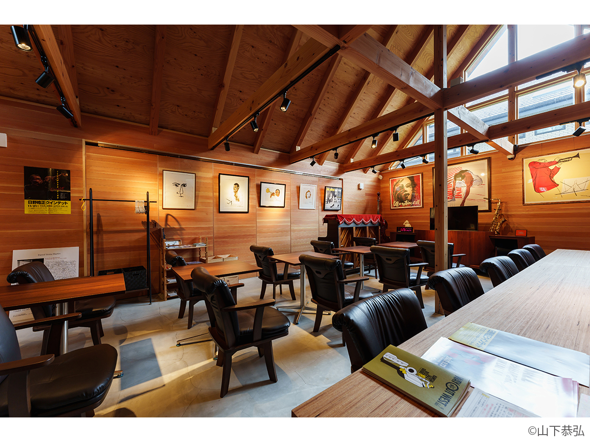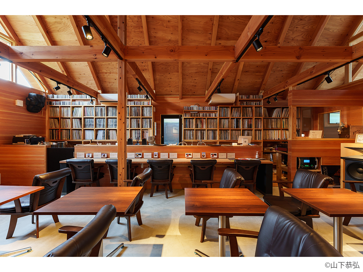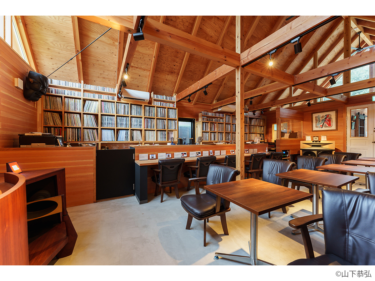 スピーカーから溢れる大音量のジャズとジャズライブの音響を考えると、気積が大きい空間の方が良い。そのため、矩勾配の切妻屋根を架け気積を確保し、両妻面の上部にガラスを入れる事で、展示壁を確保しつつも光が射し込み、外へ視線が抜ける、明るく開放的な空間を実現しようと考えました。内部仕上げは反射と吸音のバランス・「音響」を考慮して、コンクリートとガラス、木を配置しました。いくら「音響」がよくても居心地の良くない空間・場所では「音」を楽しむ事は出来ないし、良い「音」に感じることはないと思います。「音響」と「空間」がバランスし、良質なジャズ体験、そして良い時間を過ごせる空間・場所となればと思い設計しました。