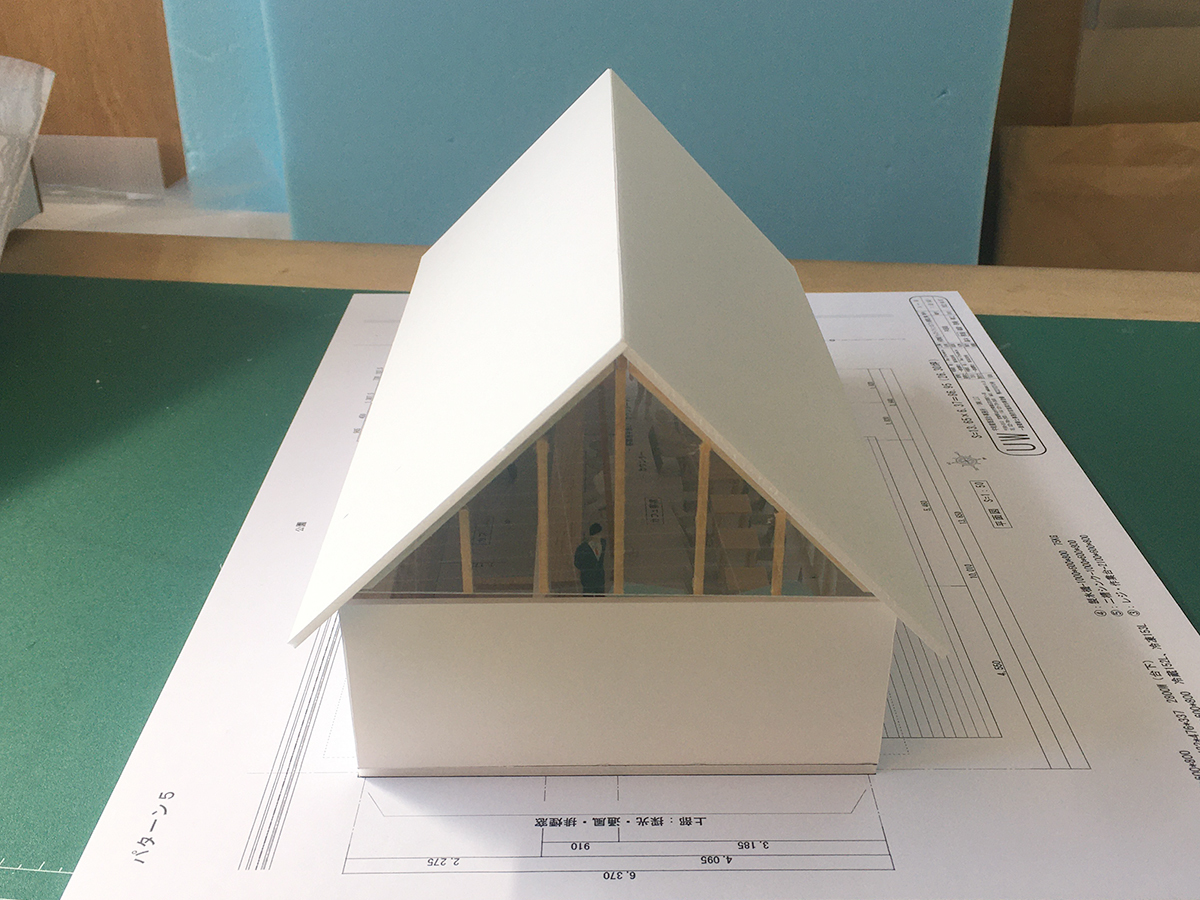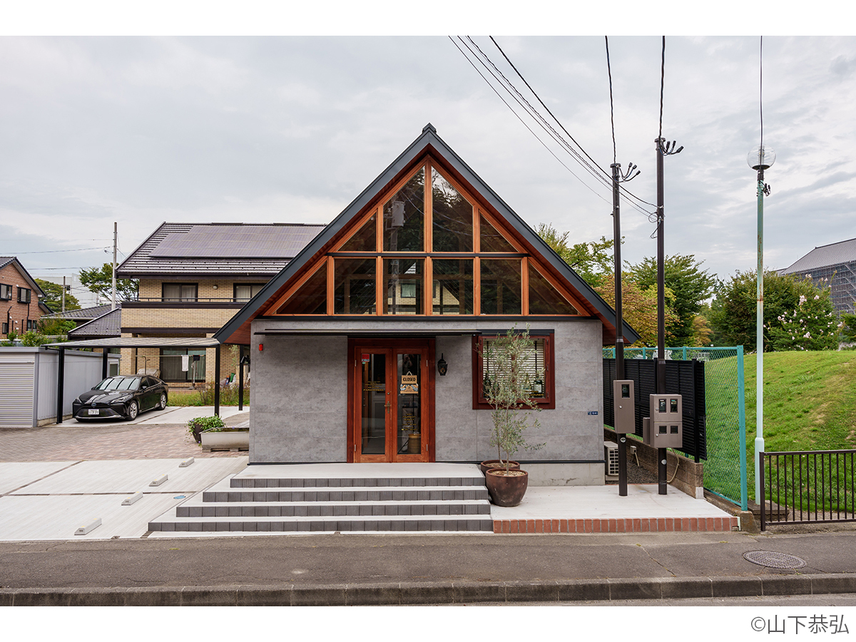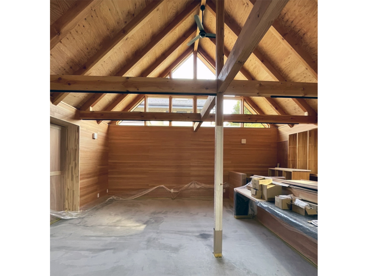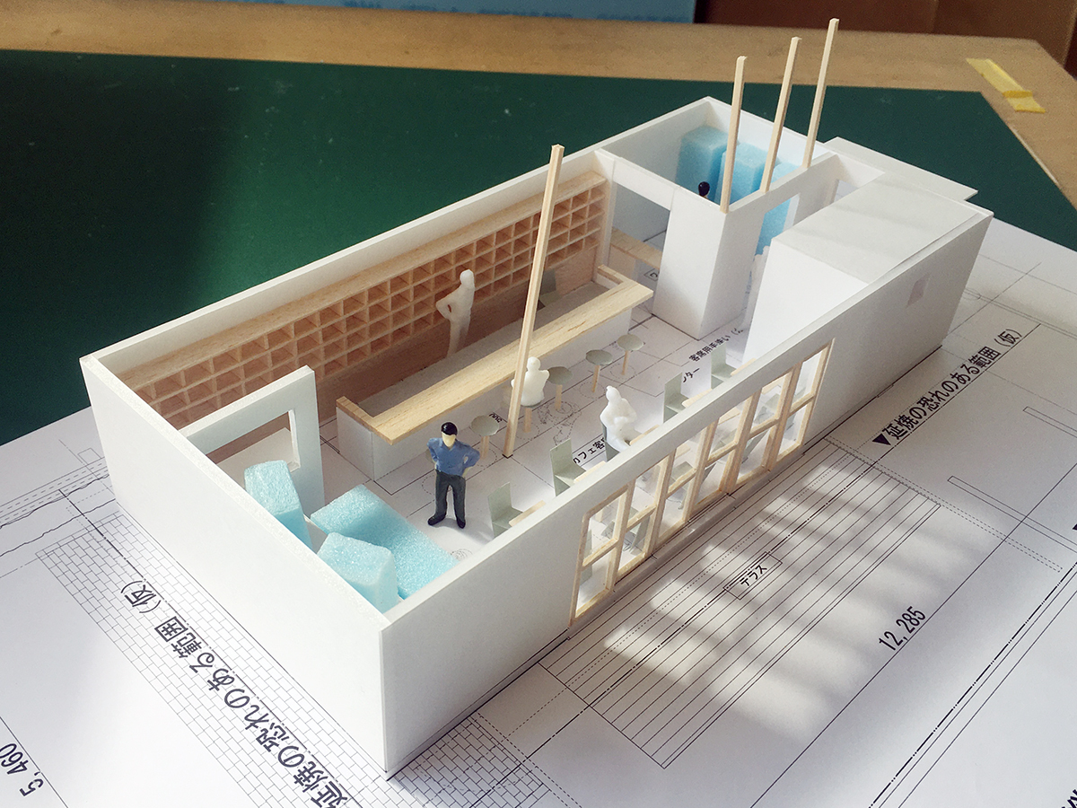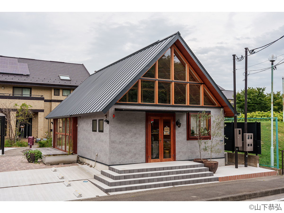 スピーカーから溢れる大音量のジャズとジャズライブの音響を考えると、気積が大きい空間の方が良い。そのため、矩勾配の切妻屋根を架け気積を確保し、両妻面の上部にガラスを入れる事で、展示壁を確保しつつも光が射し込み、外へ視線が抜ける、明るく開放的な空間を実現しようと考えました。内部仕上げは反射と吸音のバランス・「音響」を考慮して、コンクリートとガラス、木を配置しました。いくら「音響」がよくても居心地の良くない空間・場所では「音」を楽しむ事は出来ないし、良い「音」に感じることはないと思います。「音響」と「空間」がバランスし、良質なジャズ体験、そして良い時間を過ごせる空間・場所となればと思い設計しました。