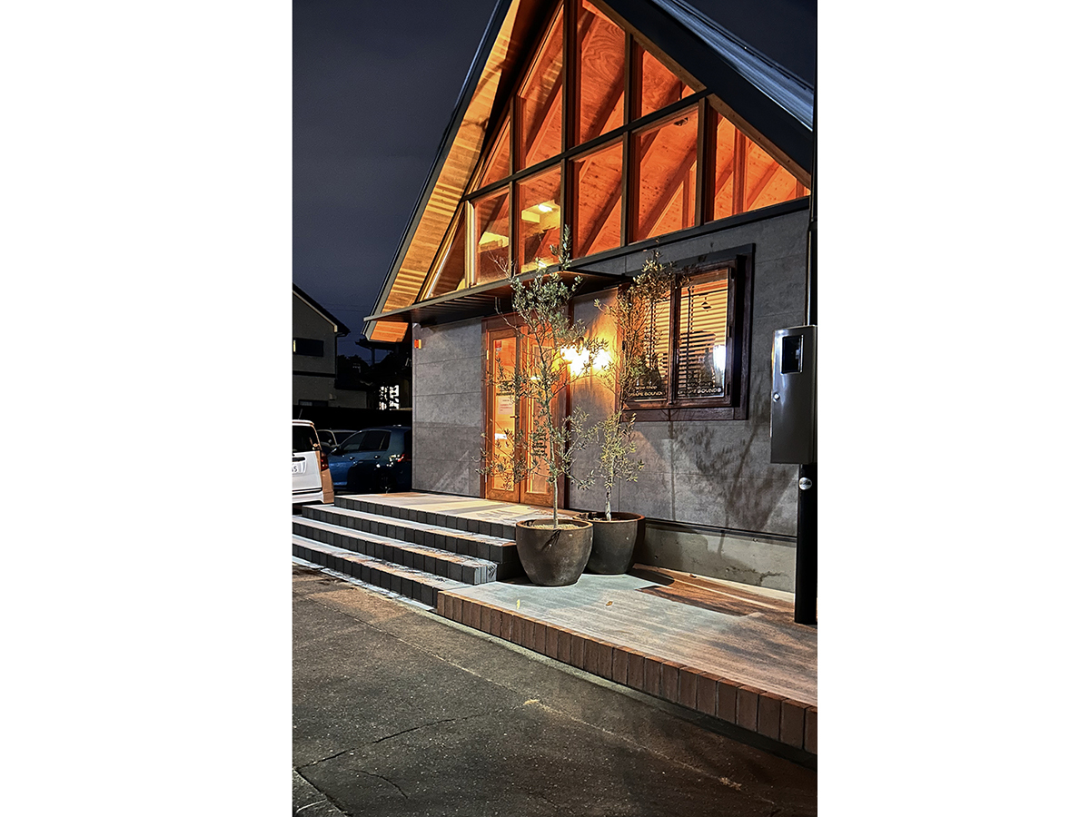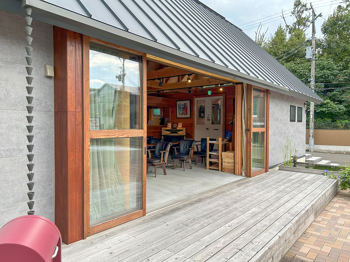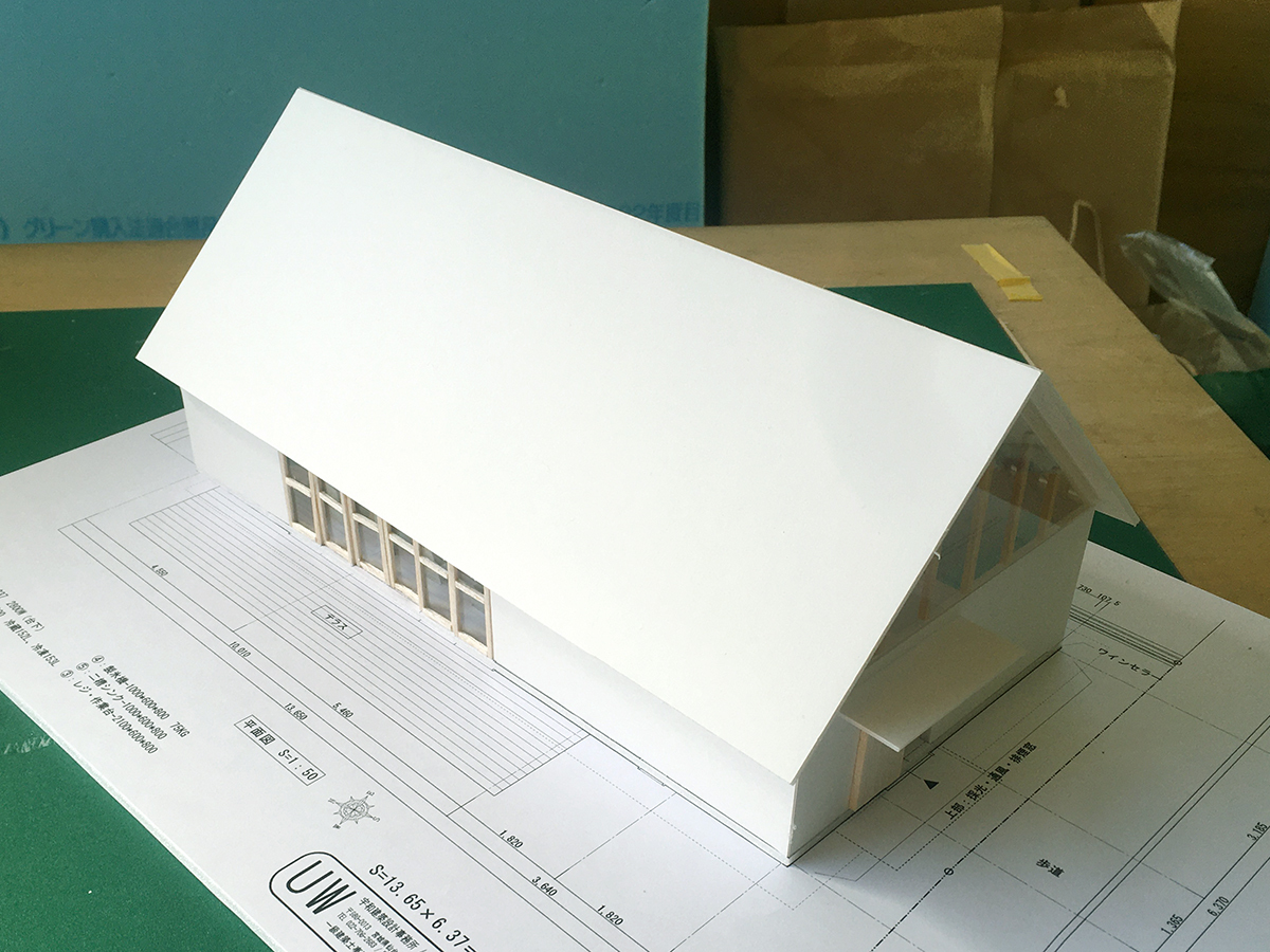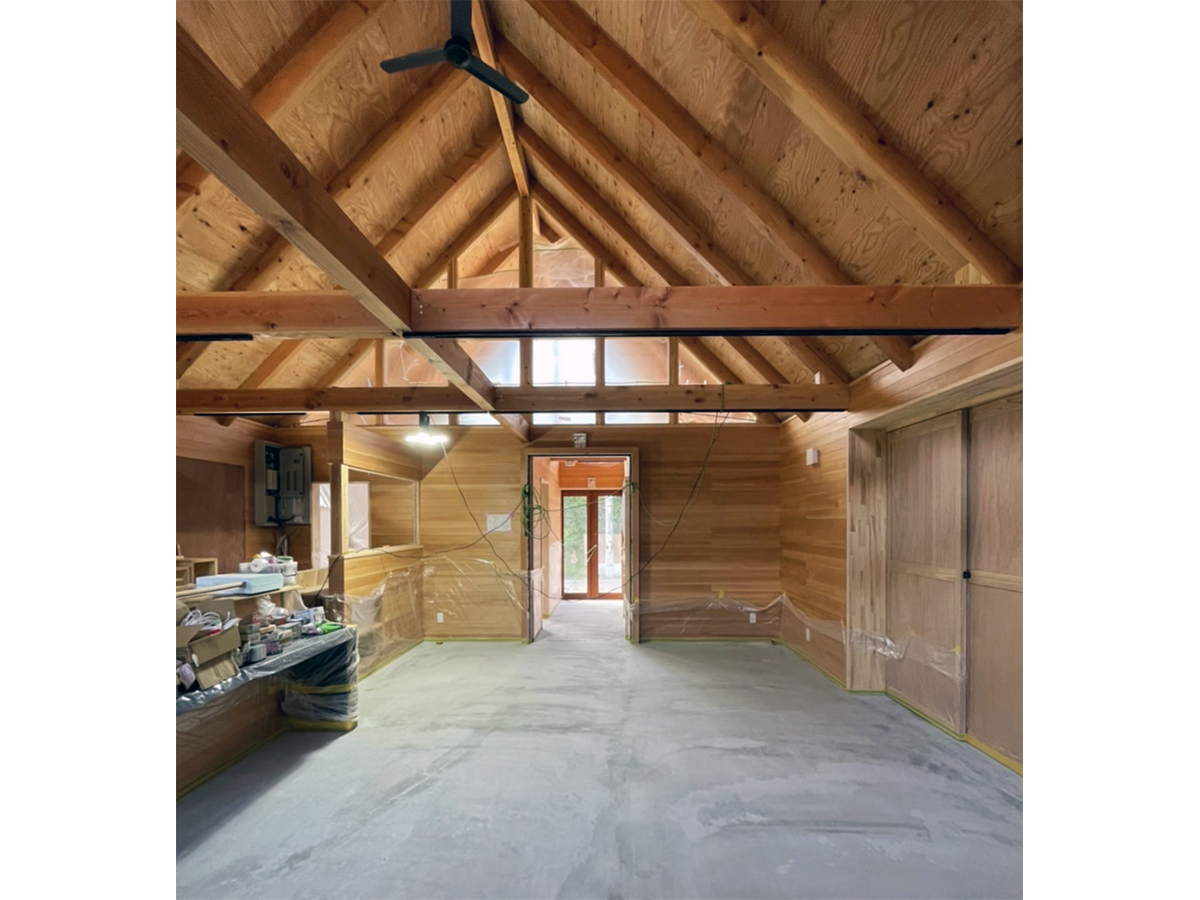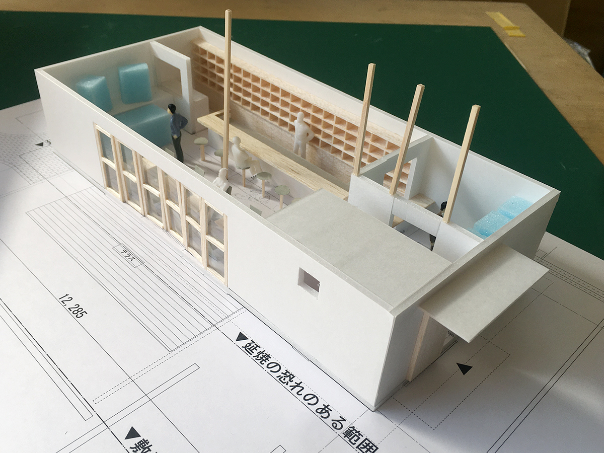 スピーカーから溢れる大音量のジャズとジャズライブの音響を考えると、気積が大きい空間の方が良い。そのため、矩勾配の切妻屋根を架け気積を確保し、両妻面の上部にガラスを入れる事で、展示壁を確保しつつも光が射し込み、外へ視線が抜ける、明るく開放的な空間を実現しようと考えました。内部仕上げは反射と吸音のバランス・「音響」を考慮して、コンクリートとガラス、木を配置しました。いくら「音響」がよくても居心地の良くない空間・場所では「音」を楽しむ事は出来ないし、良い「音」に感じることはないと思います。「音響」と「空間」がバランスし、良質なジャズ体験、そして良い時間を過ごせる空間・場所となればと思い設計しました。