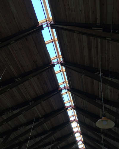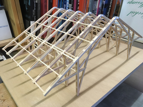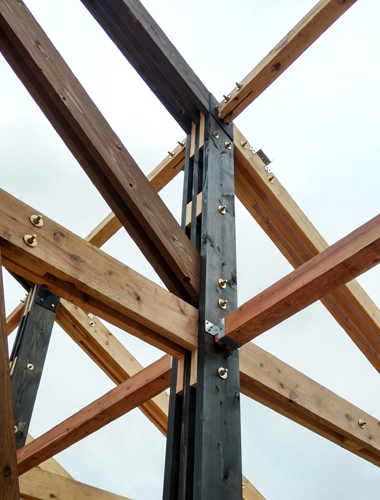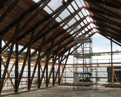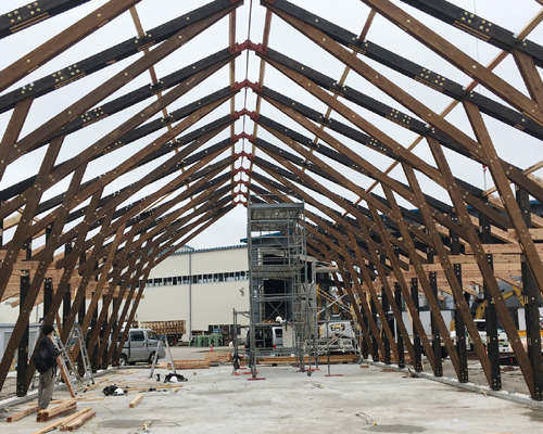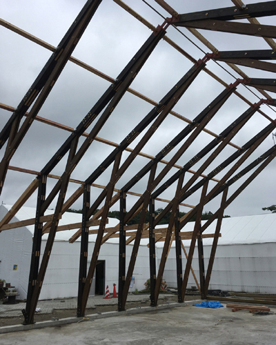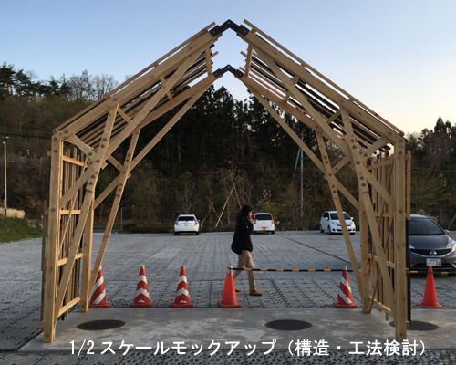 廃棄物に付加価値をつけてリサイクルする「アップサイクル」を手掛けている会社の事務所を新築した仕事です。「アップサイクル」をどのように建築に反映するかをテーマに設計に取り組みました。木材は森林資源の有効活用を考慮し、主にチップ等に利用される間伐材から切り出せる小さい部材を使用しました。小さい部材単体では弱いので、構造的に安定する三角形状に柱・梁一体で組み合わせ、約11mスパンを実現しています。