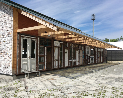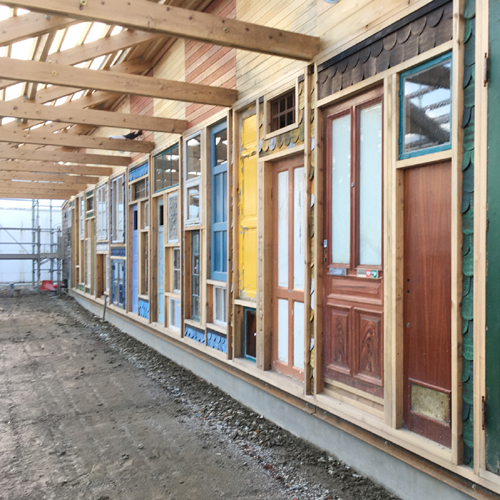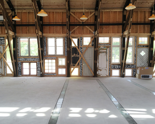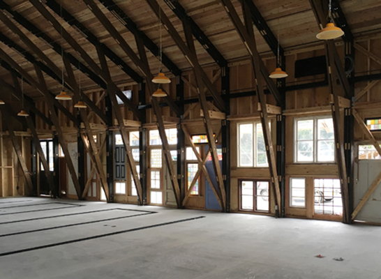 間伐材や工務店の倉庫に放置されている木材、主に燃料として利用されるRPF(古紙、プラスチック等の廃棄物が原料)を新たに開発した素材、アンティーク建具をパネル上に組み込んだ窓など、使用する材料・部材を「アップサイクル」の考え方に沿って検討し、建築に反映するよう試みました。