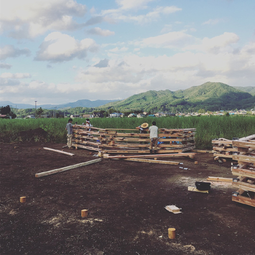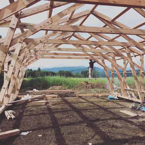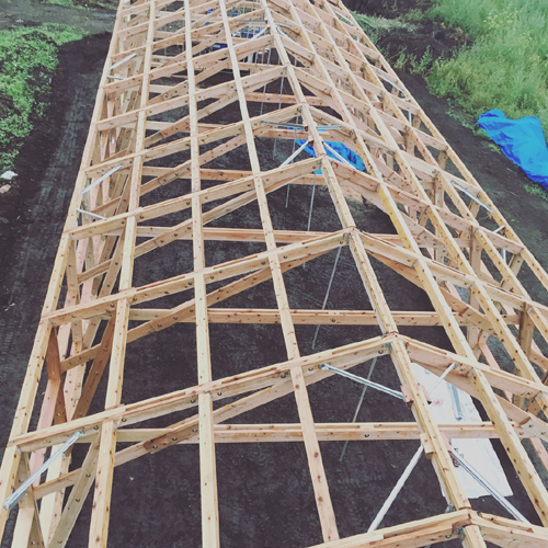 構造は仕事「001」の構造形式を用い、構造計算の結果に合わせて、部材や接合方法を簡略化しました。工場で加工された部材を、ボルトとビスで組み立てるだけなので、大工さんに指導と補助をしていただき、大工作業に不慣れな方々も一緒に施工しました。小さい部材なので軽く、部材の組み立てから建て方まで、すべて人力で約3日間で終わらせることができました。ビニル張りは、一般のビニルハウスで使われている既製品の部材を転用しています。一般的に使われている良いものや慣れているつくり方を用いて、特殊すぎるもの難しすぎるものにならないよう配慮しました。
