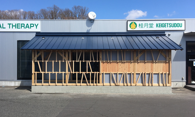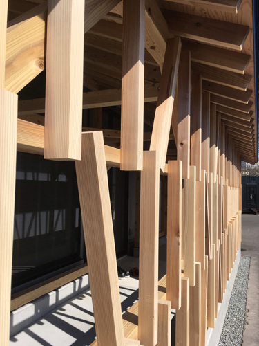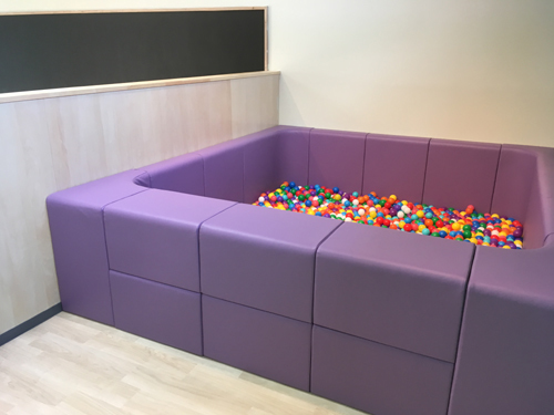 既存のエントランスは敷地内通路に面していたため、安全性を考慮しポーチを増築しました。施設へのアプローチとして、子供たちがわくわくするような、そんなポーチとなるよう木造とし、高さを抑え、部材の大きさに配慮し、木の持つあたたかさと子供の寸法に合わせたスケールを持つ安心感のある空間としています。内部は、ボールプール、感覚器具を使って遊べる場所をメインとしながら、家具で仕切った隅っこのある場所を作り、子供達の障害の特性に配慮しています。