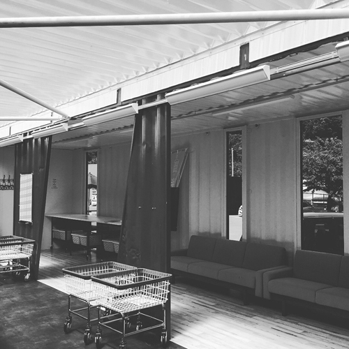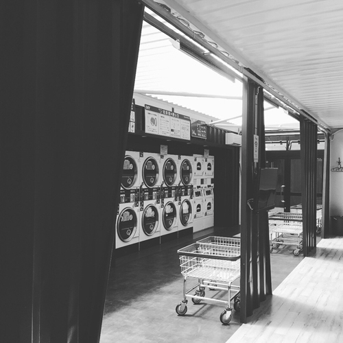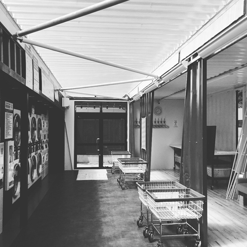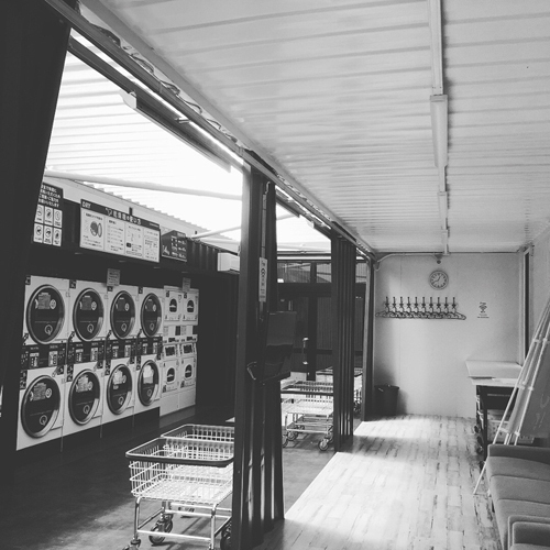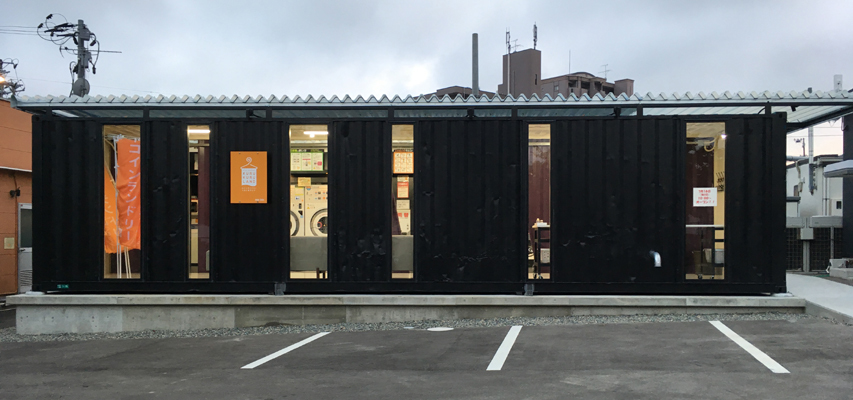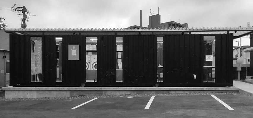事業者が所有する中古の海上コンテナを利用して、コインランドリーとした仕事です。2台のコンテナを1台分の間隔をとって設置し、全体に屋根をかけ、コンテナの「中」と2台のコンテナに挟まれた「間」の異なる質をもつ場をつくりました。また、構造的に無理のない程度にスリット状の窓をつくり、コンテナの荒々しい魅力を活かしながら適度に開放感のある空間にしました。