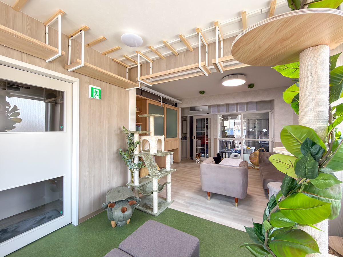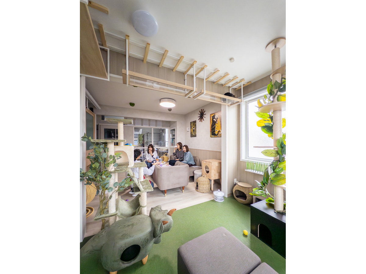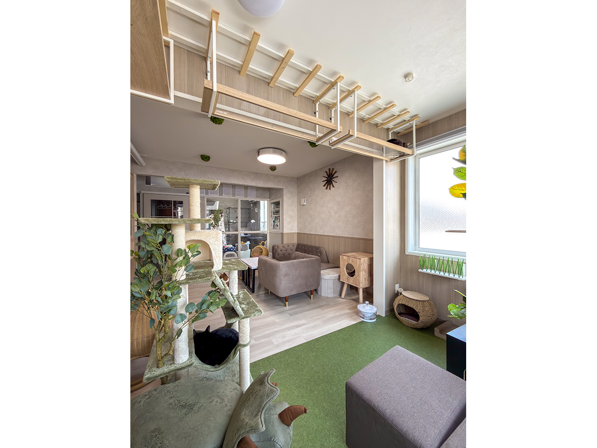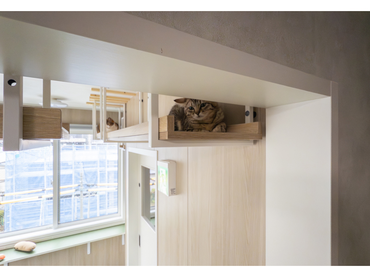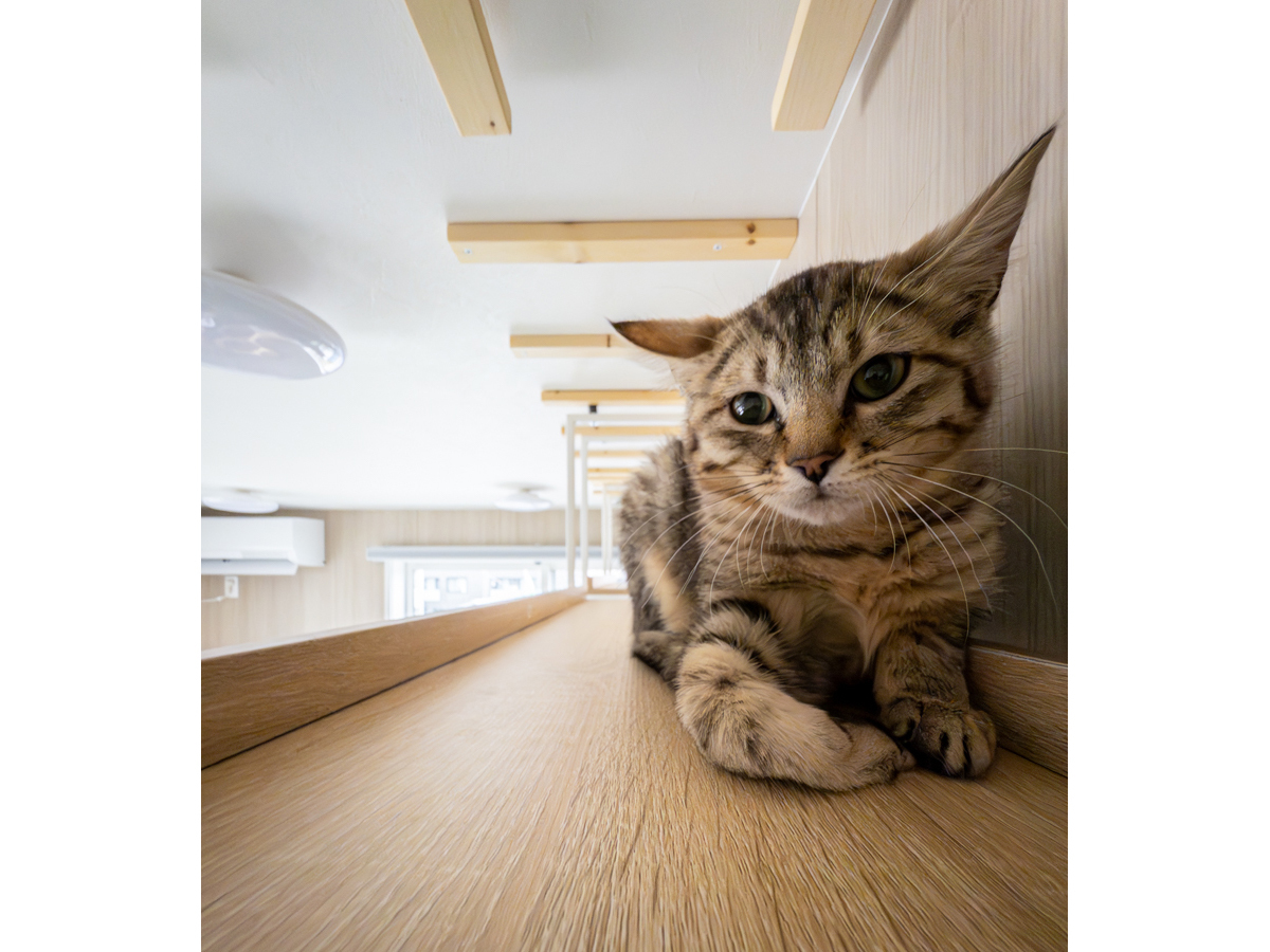 具体的には、エントランスを入ると猫が外にいるかのように、部屋の中を立体的に回遊できるように配置されたキャットウォークやキャットタワーで遊んだり、「すみっこ」で寝たり・隠れたりできる「ねこ庭」があり、「ねこ庭」を通って、猫と人が自宅にいる感覚でリラックスしてゆっくり触れ合える「ねこリビング」、その奥に「ねこリビング」から見通せる「ならし部屋」を配置する平面構成としました。それぞれの部屋は意図や目的・機能に応じた素材・色彩としつつ、グラデーショナルに配色を変化させていくことで、それぞれの部屋の個性を生かしつつも「ねこの家」全体にまとまりと広がりを感じられるように配慮しました。