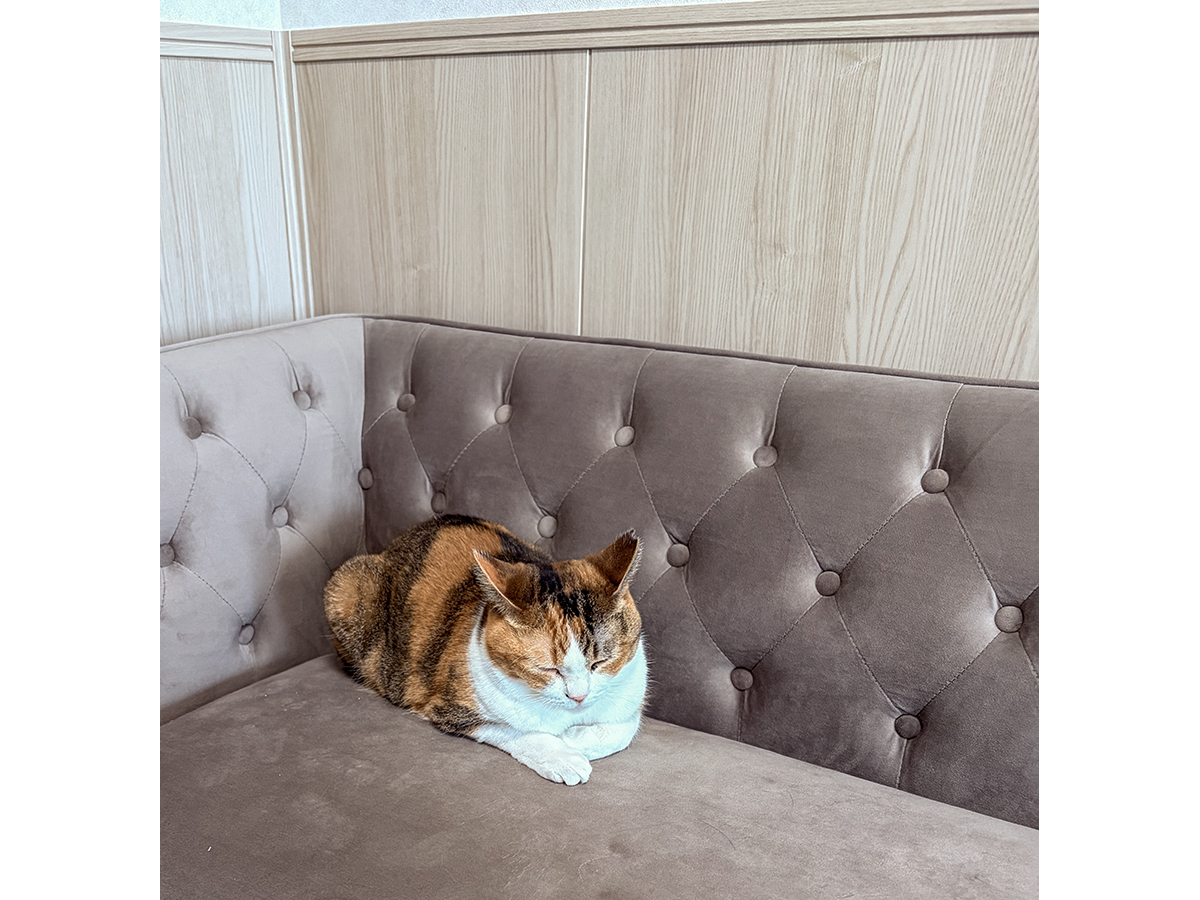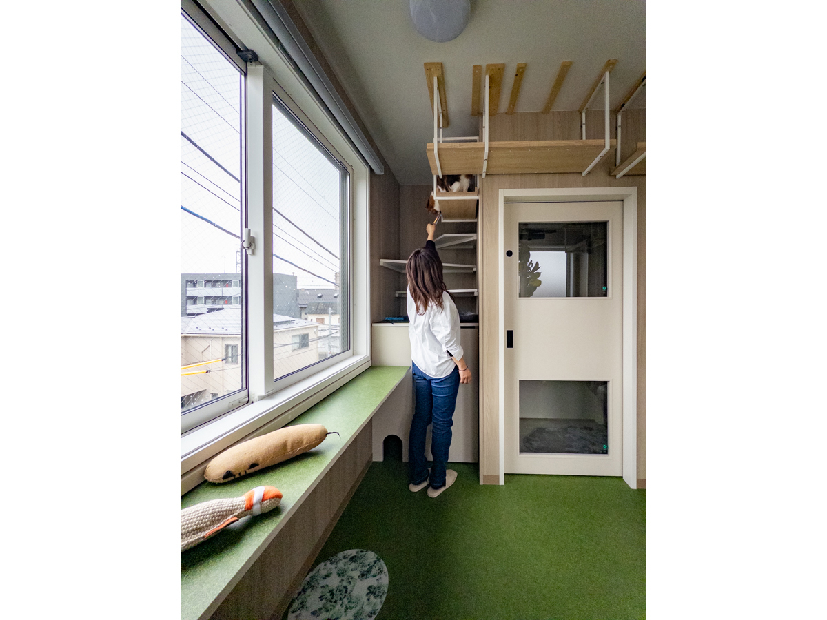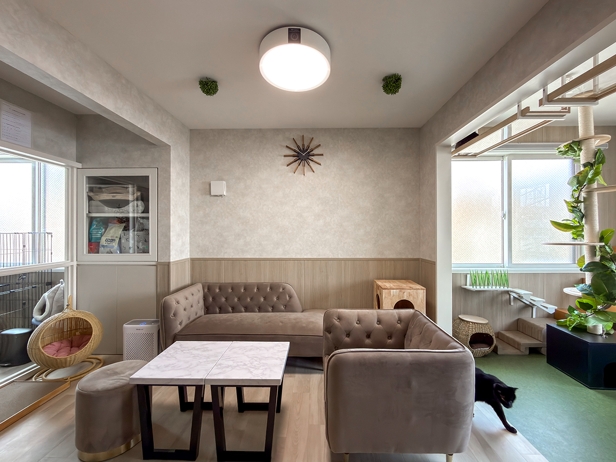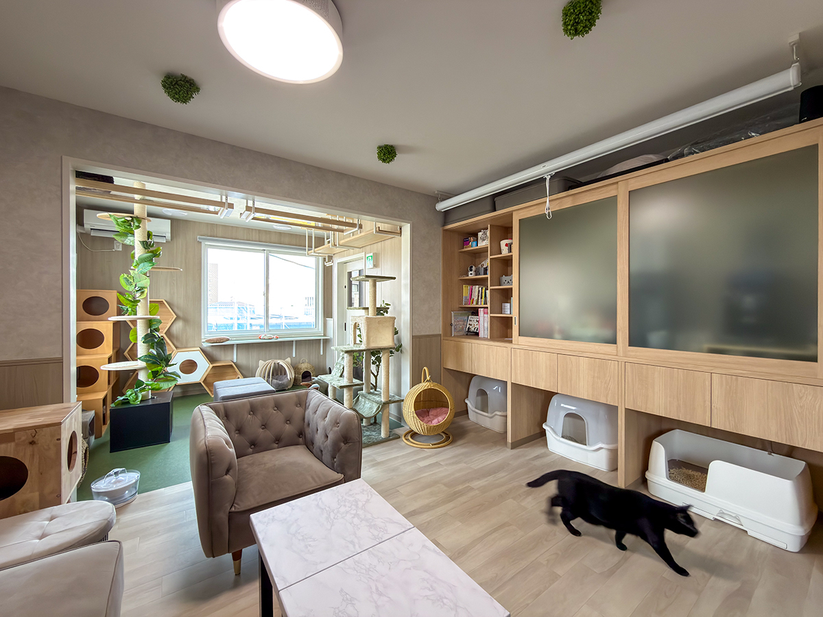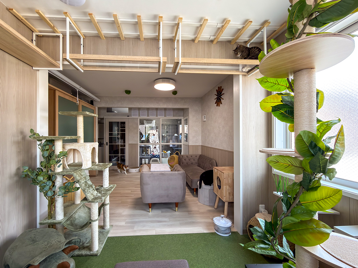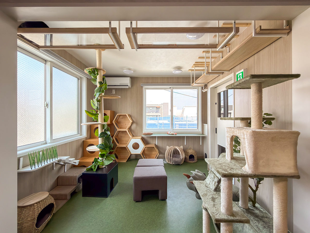 具体的には、エントランスを入ると猫が外にいるかのように、部屋の中を立体的に回遊できるように配置されたキャットウォークやキャットタワーで遊んだり、「すみっこ」で寝たり・隠れたりできる「ねこ庭」があり、「ねこ庭」を通って、猫と人が自宅にいる感覚でリラックスしてゆっくり触れ合える「ねこリビング」、その奥に「ねこリビング」から見通せる「ならし部屋」を配置する平面構成としました。それぞれの部屋は意図や目的・機能に応じた素材・色彩としつつ、グラデーショナルに配色を変化させていくことで、それぞれの部屋の個性を生かしつつも「ねこの家」全体にまとまりと広がりを感じられるように配慮しました。