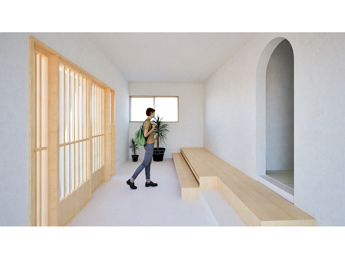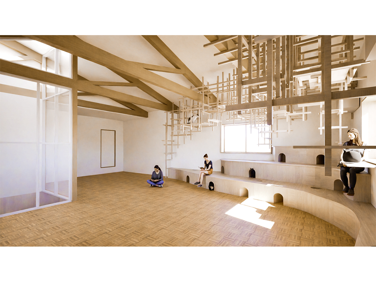 2階部分は「住まい」ですが、光井戸に面した大部屋は天井を撤去し、ヨガやメディテーション等を行う梁現しの高天井のスタジオ兼猫の部屋としています。スタジオ内は立体木格子<くも>が床から梁・天井へと格子の密度を変えながら空間を軽やかに舞い、段状に構成された不定形なベンチ<なみ>が<くも>と連動して、空間を引き締めるアクセントとなるよう意図しました。