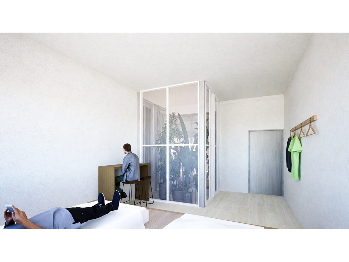 また各部屋の床面積が大きかったことから、1階の「つづき間」を壁で区画し2・3・6名用の3つの宿泊室をつくり、既存の浴室を解体しLDと一室にすることで、宿泊者用のLDKとしました。建物の中心部分にあるエレベーターは撤去し、2層吹抜けの光井戸とすることで、採光や通風、高さ方向の空間的な広がりをつくる計画としています。