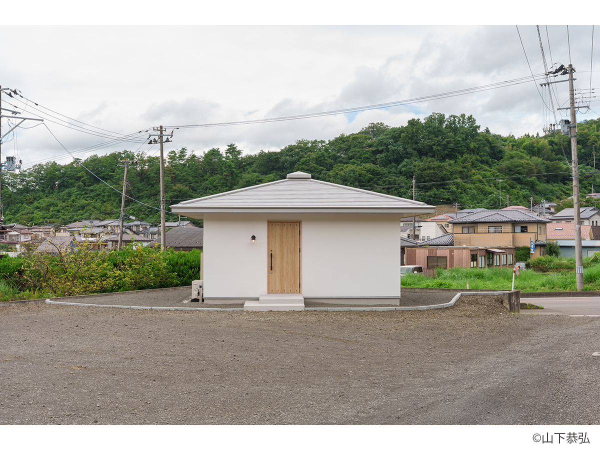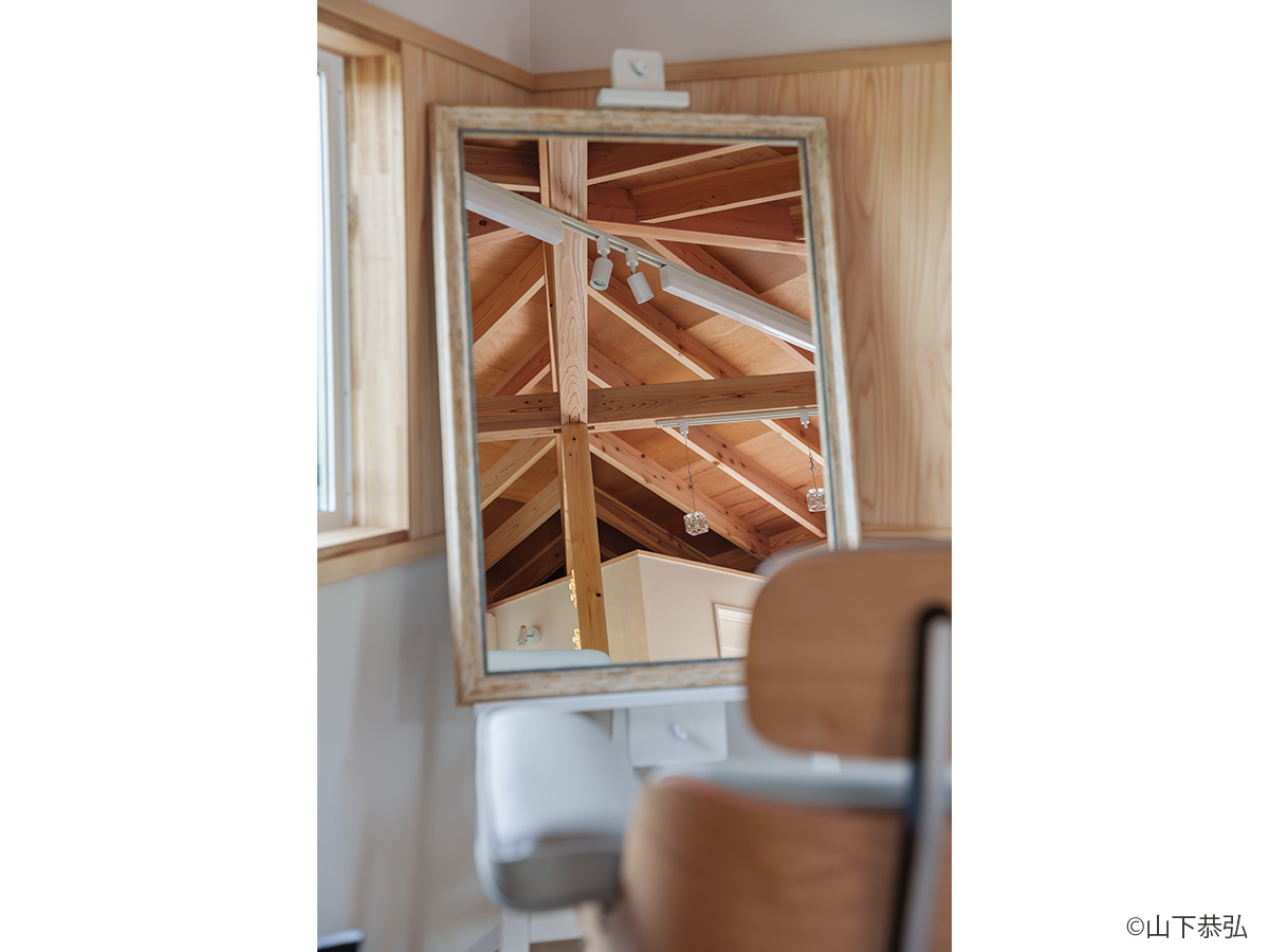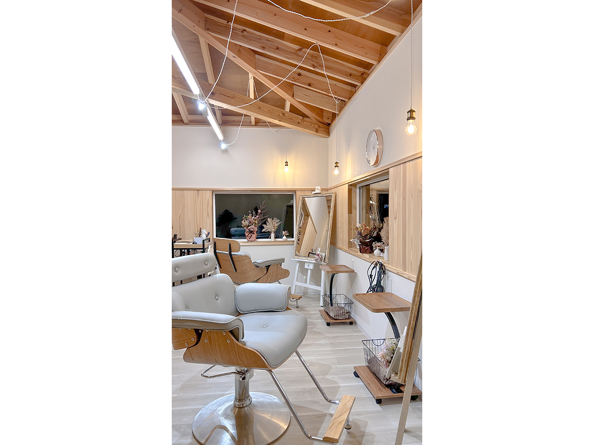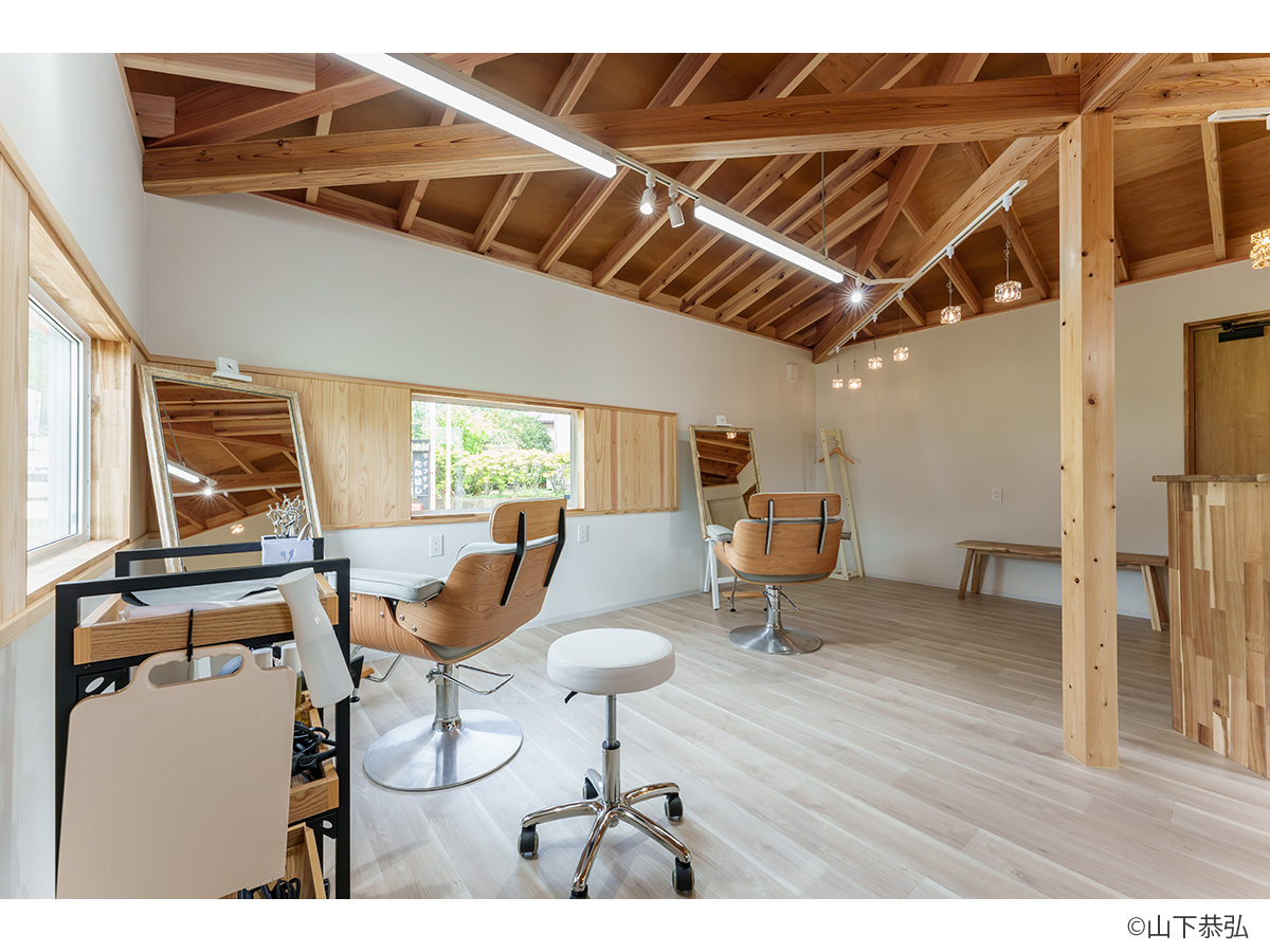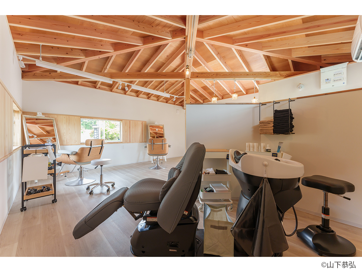 宮城県白石市に美容室を新築する仕事です。敷地北側が道路に面し、周辺建物は道路沿いに平行に建っています。そのため、配置を道路に対して30°振ることで、建物の立面2面が見えるようにして視認性を良くすると同時に、周辺建物と異なった建ち方が「お店」の特徴となるようにしました。資材が日を追うごとに高騰していく状況の中、ローコストに抑えかつ要望を満たしていくためにどうするか。内装や外装仕上にかかるコストを抑えてでも、使い勝手を考えると床面積はできる限り確保したい。複数案検討し、打合せと検討を重た結果、一辺5.46m(3間)の正方形平面に落ち着きました。梁を対角線に架けることで長辺に視線を誘導し、さらにはカット面やシャンプー台も対角線に合わせてレイアウトすることで「広がり」を感じる空間にしています。また、壁の面的要素と現しの垂木梁の線的要素を対比的に表現することで、空間の「広がり」と「動き」を際立たせました。