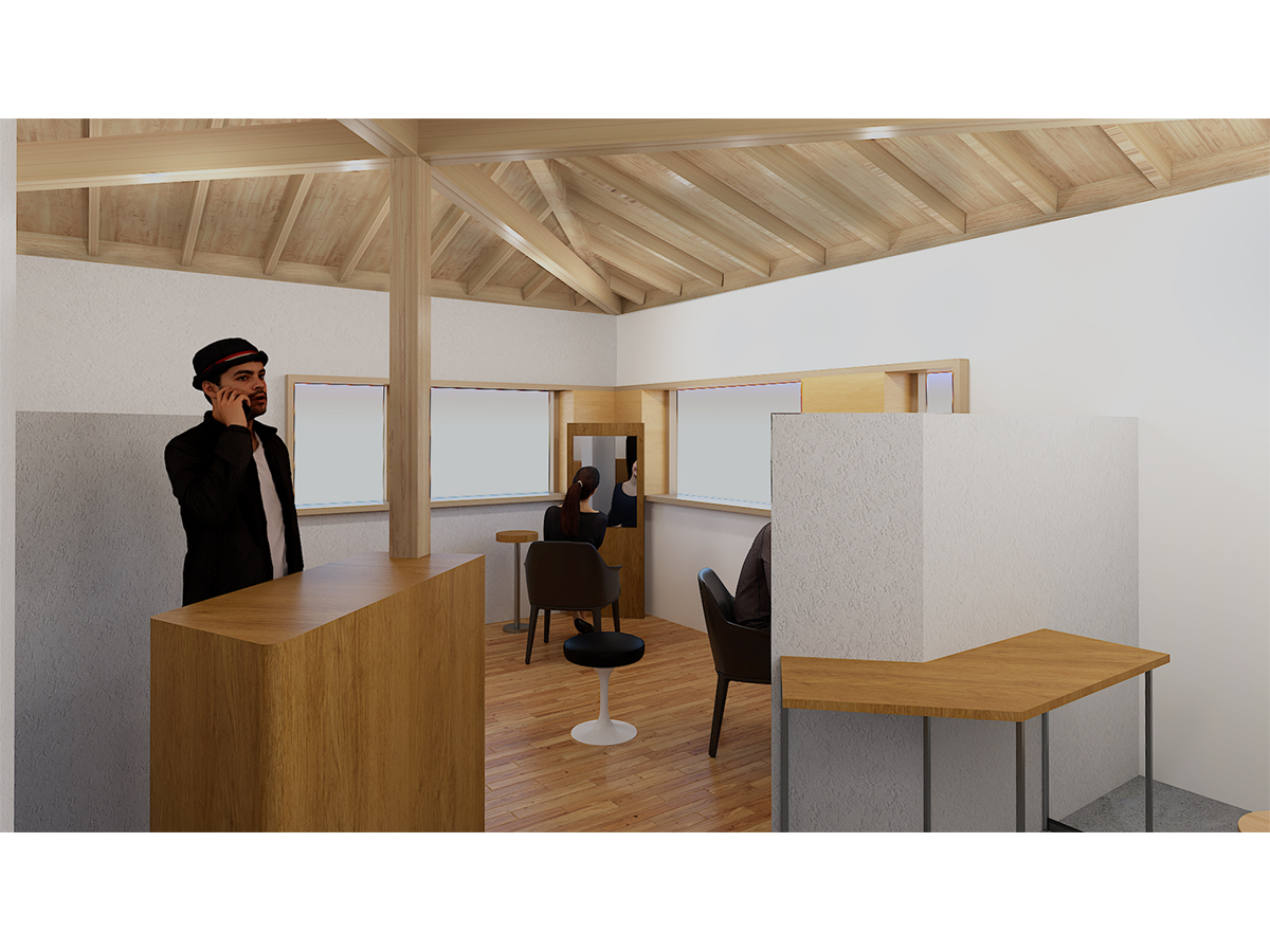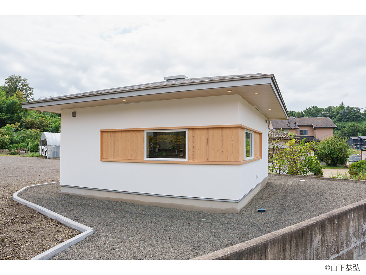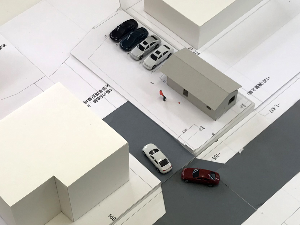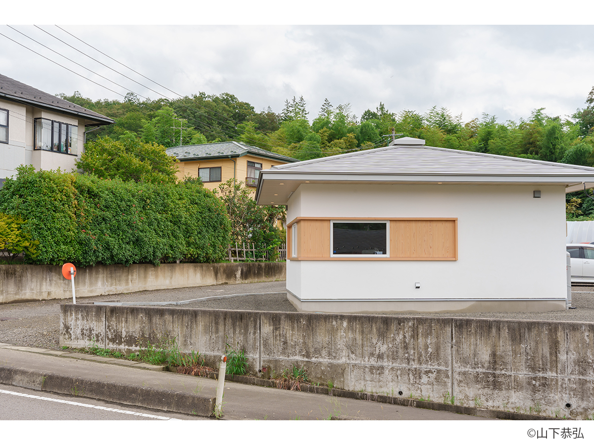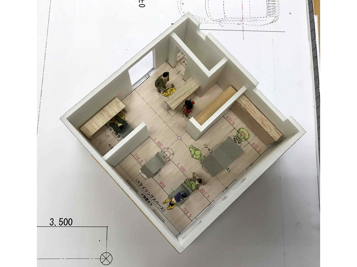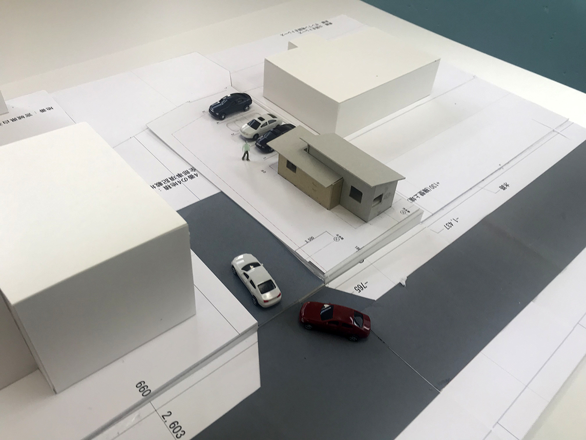 宮城県白石市に美容室を新築する仕事です。敷地北側が道路に面し、周辺建物は道路沿いに平行に建っています。そのため、配置を道路に対して30°振ることで、建物の立面2面が見えるようにして視認性を良くすると同時に、周辺建物と異なった建ち方が「お店」の特徴となるようにしました。資材が日を追うごとに高騰していく状況の中、ローコストに抑えかつ要望を満たしていくためにどうするか。内装や外装仕上にかかるコストを抑えてでも、使い勝手を考えると床面積はできる限り確保したい。複数案検討し、打合せと検討を重た結果、一辺5.46m(3間)の正方形平面に落ち着きました。梁を対角線に架けることで長辺に視線を誘導し、さらにはカット面やシャンプー台も対角線に合わせてレイアウトすることで「広がり」を感じる空間にしています。また、壁の面的要素と現しの垂木梁の線的要素を対比的に表現することで、空間の「広がり」と「動き」を際立たせました。