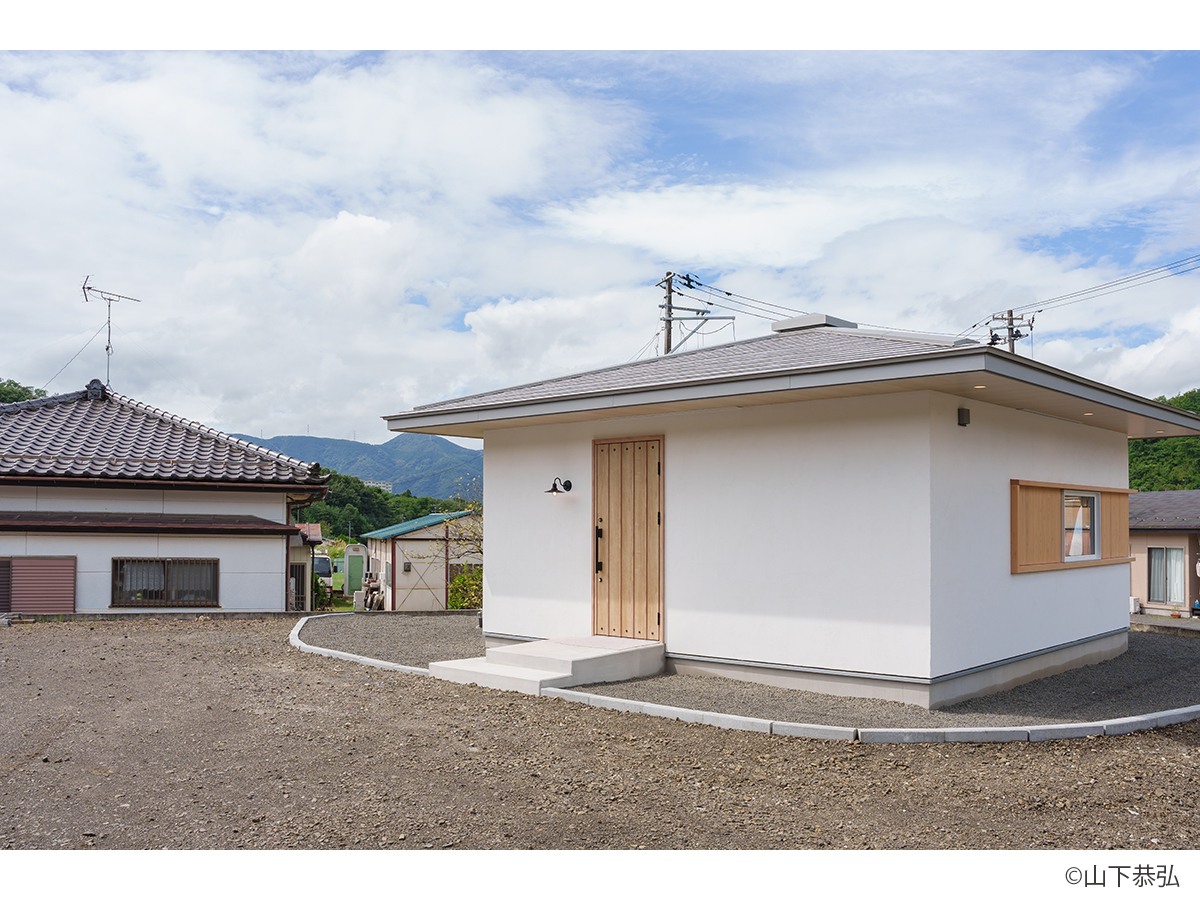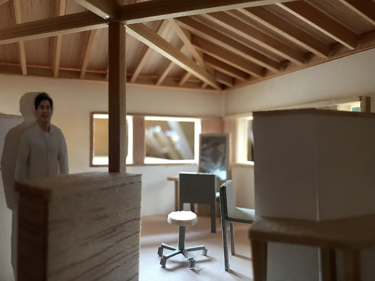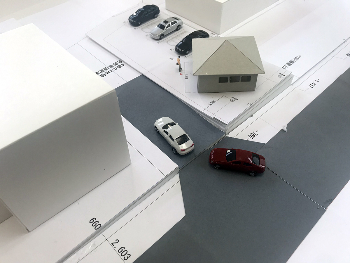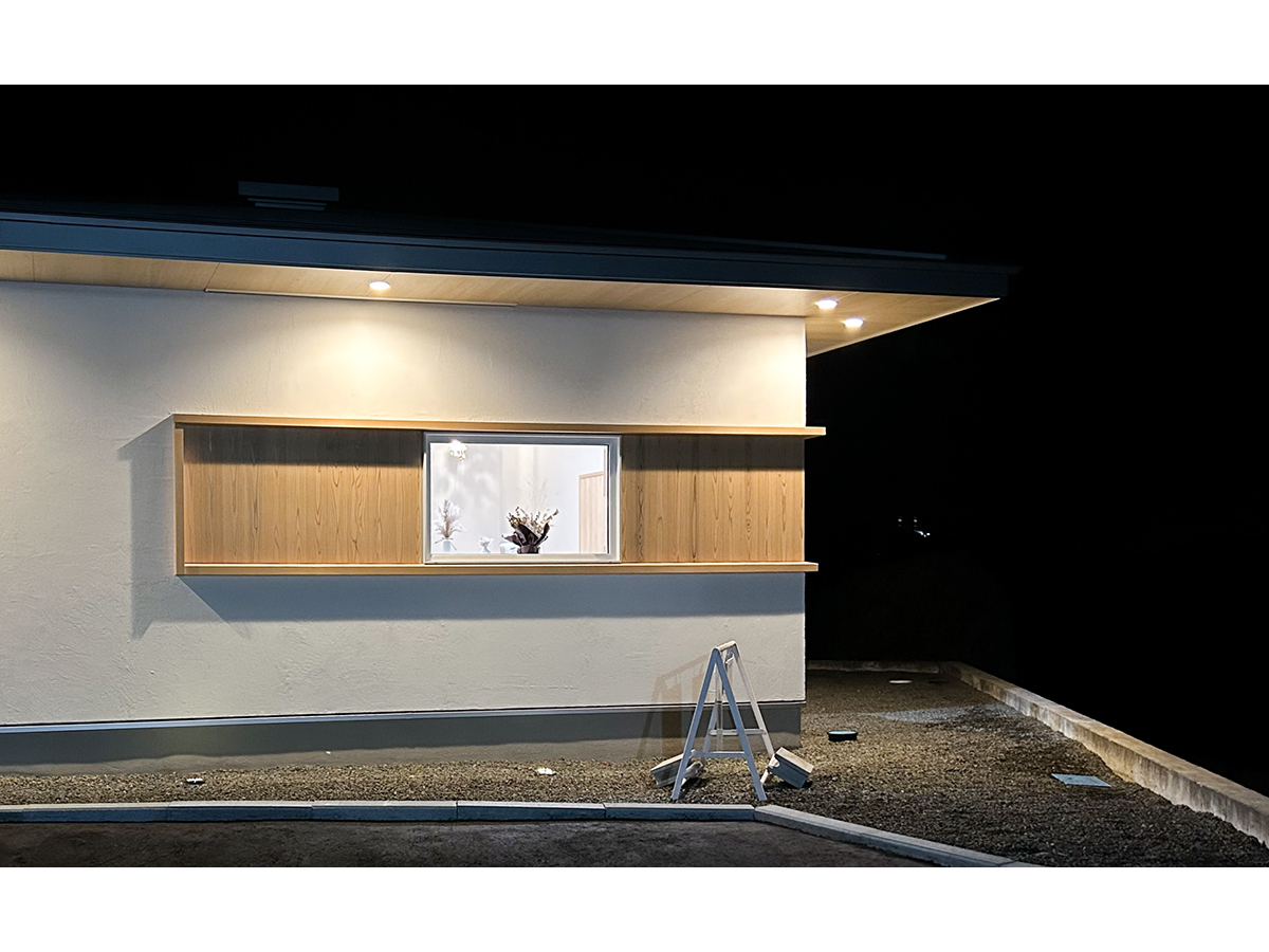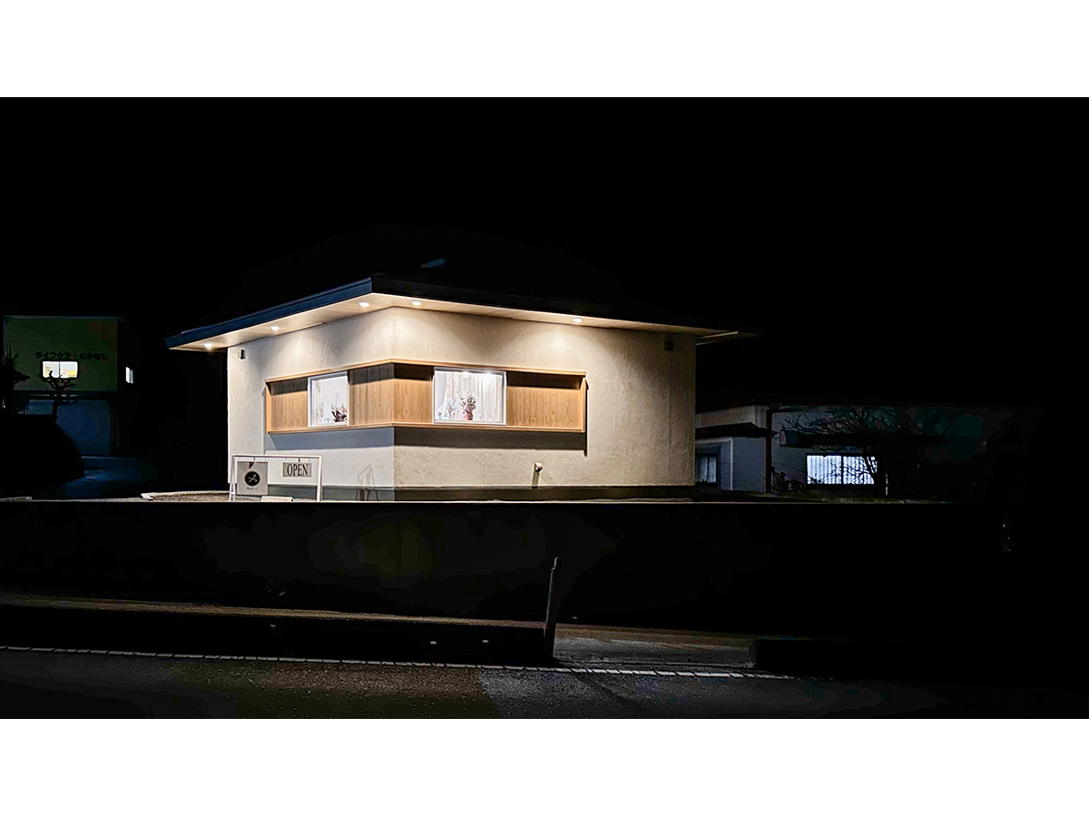宮城県白石市に美容室を新築する仕事です。敷地北側が道路に面し、周辺建物は道路沿いに平行に建っています。そのため、配置を道路に対して30°振ることで、建物の立面2面が見えるようにして視認性を良くすると同時に、周辺建物と異なった建ち方が「お店」の特徴となるようにしました。資材が日を追うごとに高騰していく状況の中、ローコストに抑えかつ要望を満たしていくためにどうするか。内装や外装仕上にかかるコストを抑えてでも、使い勝手を考えると床面積はできる限り確保したい。複数案検討し、打合せと検討を重た結果、一辺5.46m(3間)の正方形平面に落ち着きました。梁を対角線に架けることで長辺に視線を誘導し、さらにはカット面やシャンプー台も対角線に合わせてレイアウトすることで「広がり」を感じる空間にしています。また、壁の面的要素と現しの垂木梁の線的要素を対比的に表現することで、空間の「広がり」と「動き」を際立たせました。