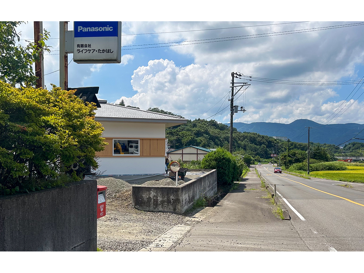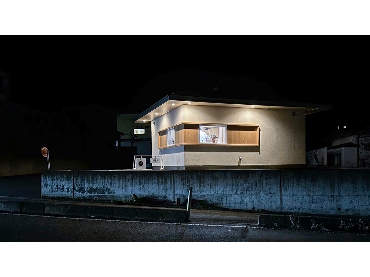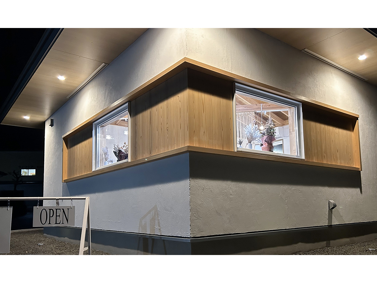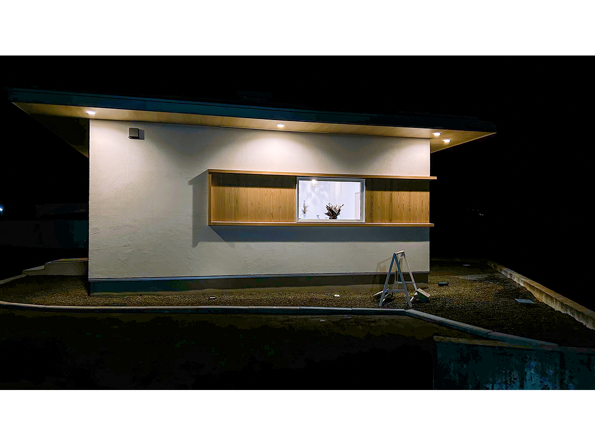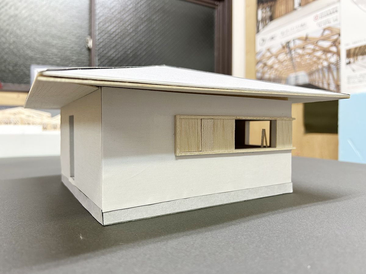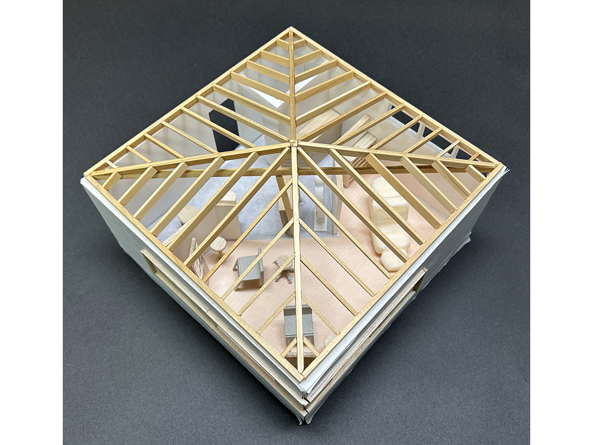 宮城県白石市に美容室を新築する仕事です。敷地北側が道路に面し、周辺建物は道路沿いに平行に建っています。そのため、配置を道路に対して30°振ることで、建物の立面2面が見えるようにして視認性を良くすると同時に、周辺建物と異なった建ち方が「お店」の特徴となるようにしました。資材が日を追うごとに高騰していく状況の中、ローコストに抑えかつ要望を満たしていくためにどうするか。内装や外装仕上にかかるコストを抑えてでも、使い勝手を考えると床面積はできる限り確保したい。複数案検討し、打合せと検討を重た結果、一辺5.46m(3間)の正方形平面に落ち着きました。梁を対角線に架けることで長辺に視線を誘導し、さらにはカット面やシャンプー台も対角線に合わせてレイアウトすることで「広がり」を感じる空間にしています。また、壁の面的要素と現しの垂木梁の線的要素を対比的に表現することで、空間の「広がり」と「動き」を際立たせました。