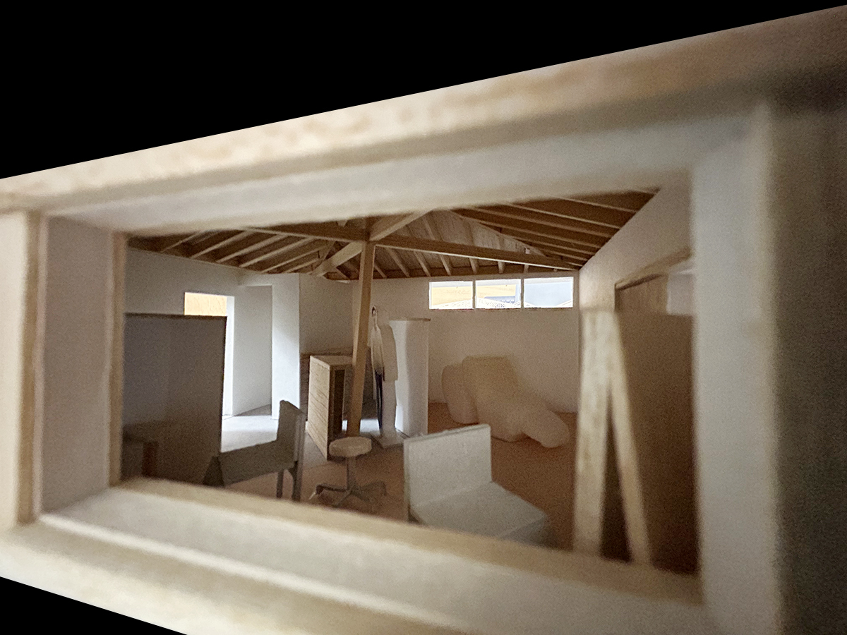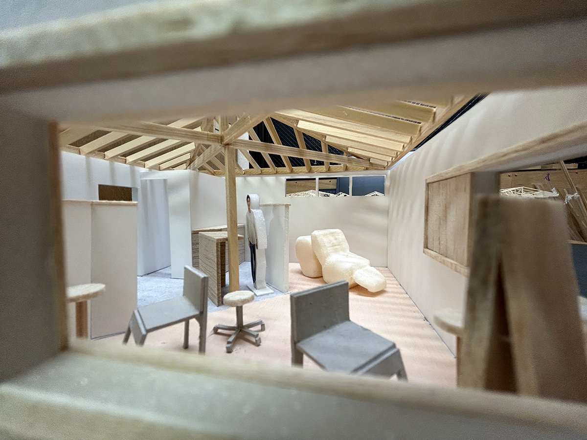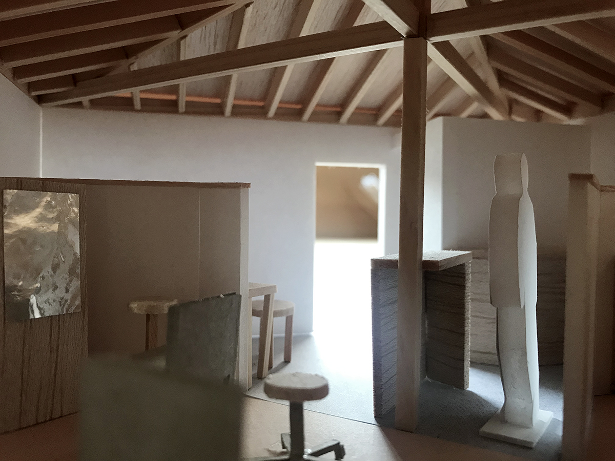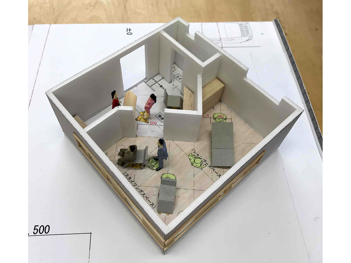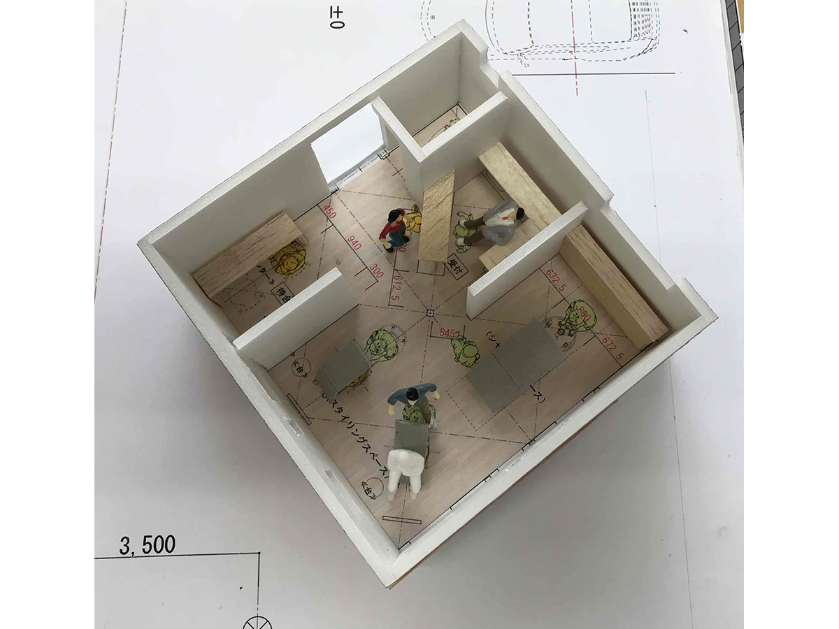 宮城県白石市に美容室を新築する仕事です。敷地北側が道路に面し、周辺建物は道路沿いに平行に建っています。そのため、配置を道路に対して30°振ることで、建物の立面2面が見えるようにして視認性を良くすると同時に、周辺建物と異なった建ち方が「お店」の特徴となるようにしました。資材が日を追うごとに高騰していく状況の中、ローコストに抑えかつ要望を満たしていくためにどうするか。内装や外装仕上にかかるコストを抑えてでも、使い勝手を考えると床面積はできる限り確保したい。複数案検討し、打合せと検討を重た結果、一辺5.46m(3間)の正方形平面に落ち着きました。梁を対角線に架けることで長辺に視線を誘導し、さらにはカット面やシャンプー台も対角線に合わせてレイアウトすることで「広がり」を感じる空間にしています。また、壁の面的要素と現しの垂木梁の線的要素を対比的に表現することで、空間の「広がり」と「動き」を際立たせました。